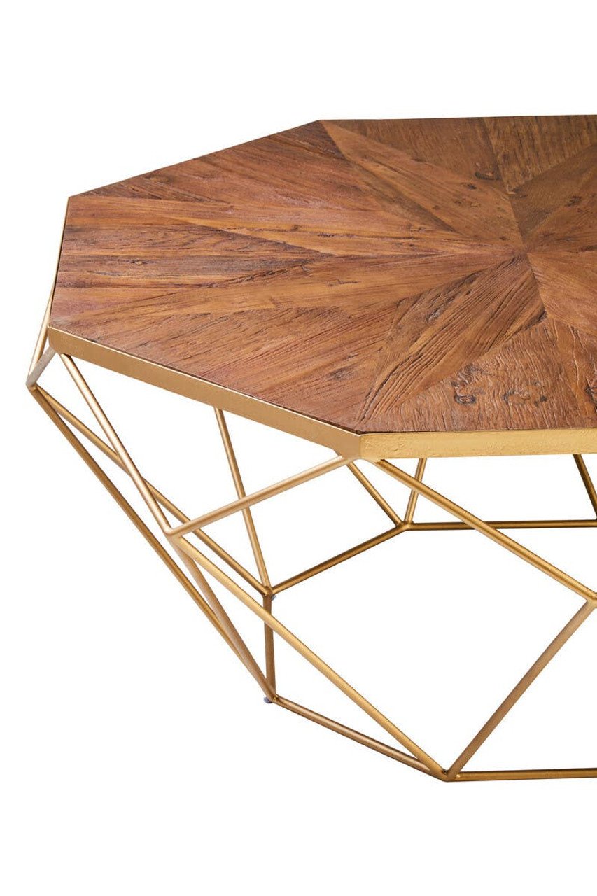This modern coffee table with warm gold finish frame featuring simple lines which contribute classic elegance and sophistication. The Elm wood octagonal top offers rustic warmth and coordinates with angular wireframe.