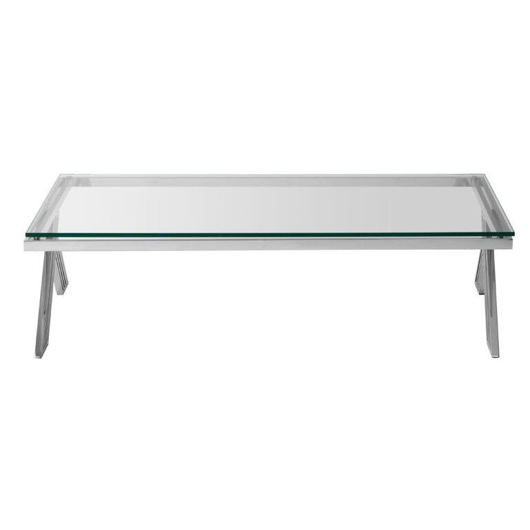 Piet Clear Glass Coffee Table: This rectangular coffee table is suited to luxe-style interior settings. Its angled legs are crafted from smooth stainless steel and have a reflective silver finish. Clear glass sits atop the frame, creating a transparent finish.