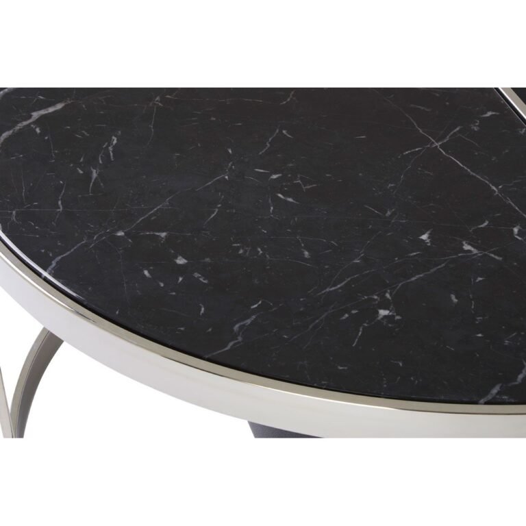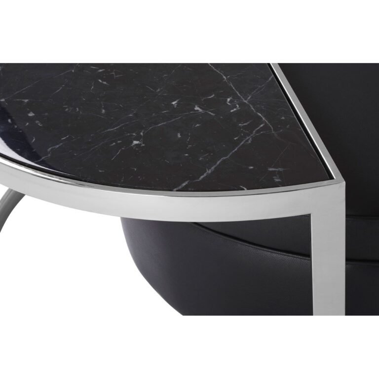 The Piet Stool And Coffee Table Set embodies modern luxe design with its rich colour palettes and exquisite materials. The semicircular coffee table is created from smooth stainless steel with a reflective silver finish, while black marble adds an elegant touch to the table’s top. The black faux leather footstool nests comfortable underneath the table when not in use.