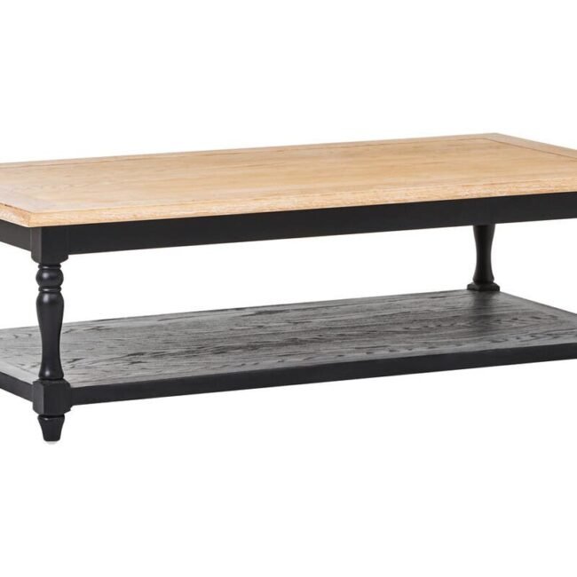 The Regents Townhouse Antique Coffee Table features a grey oak wood and antique black birchwood frame.