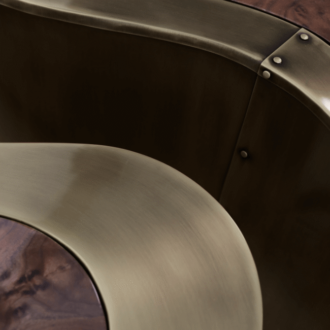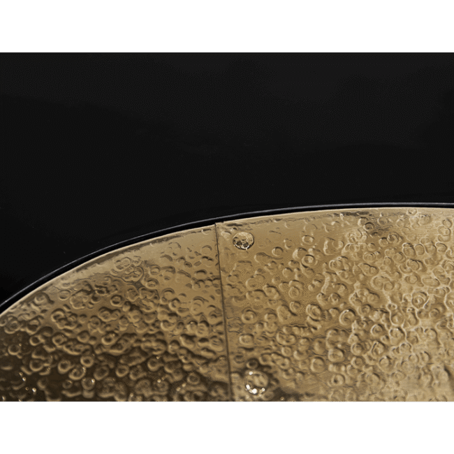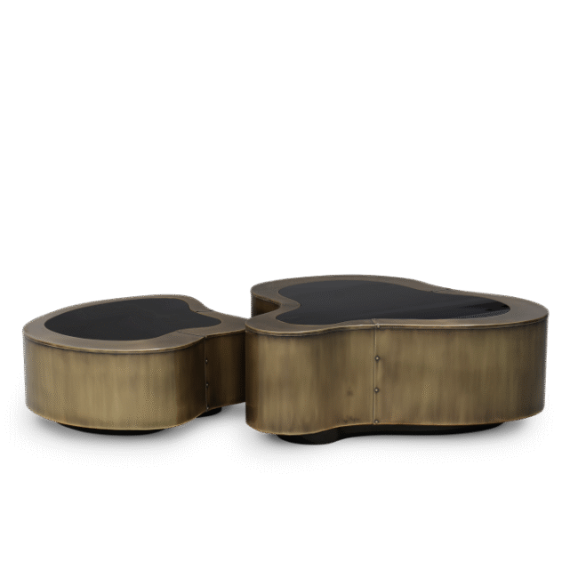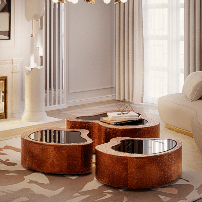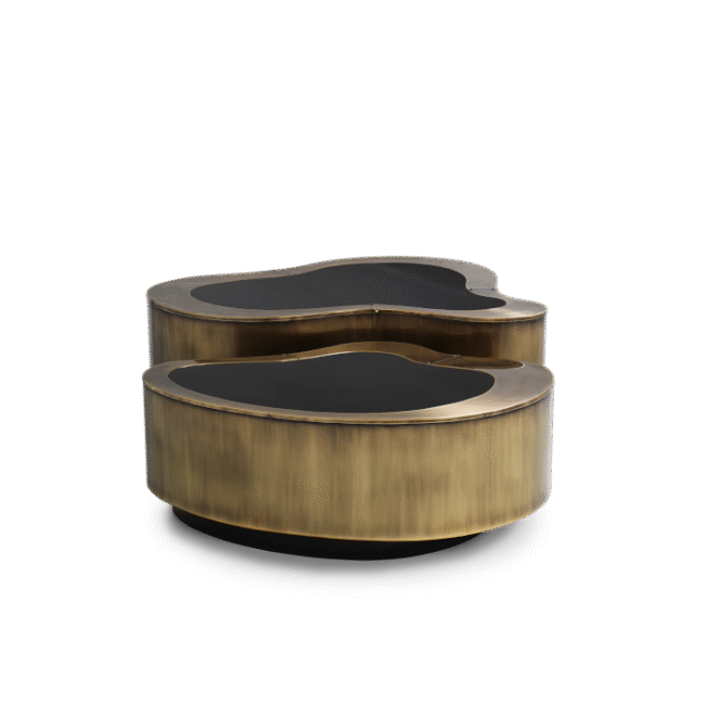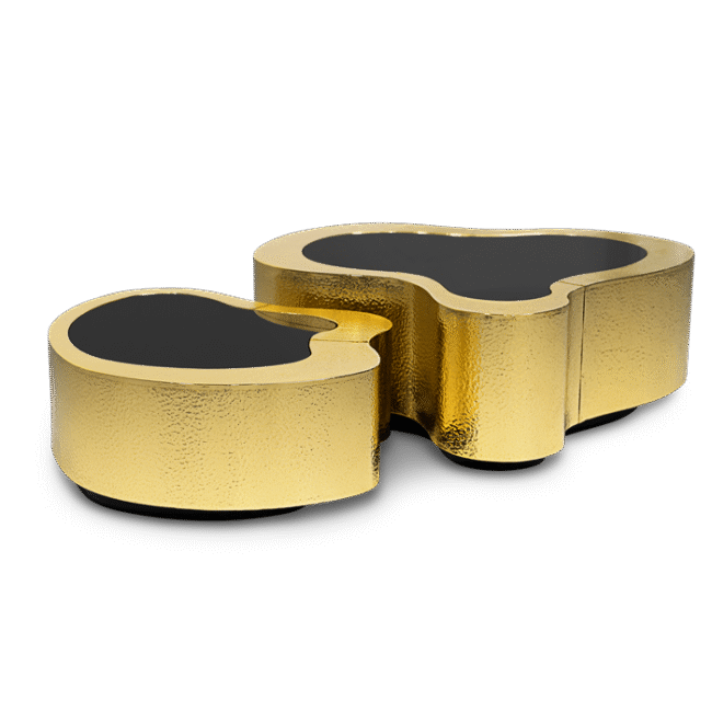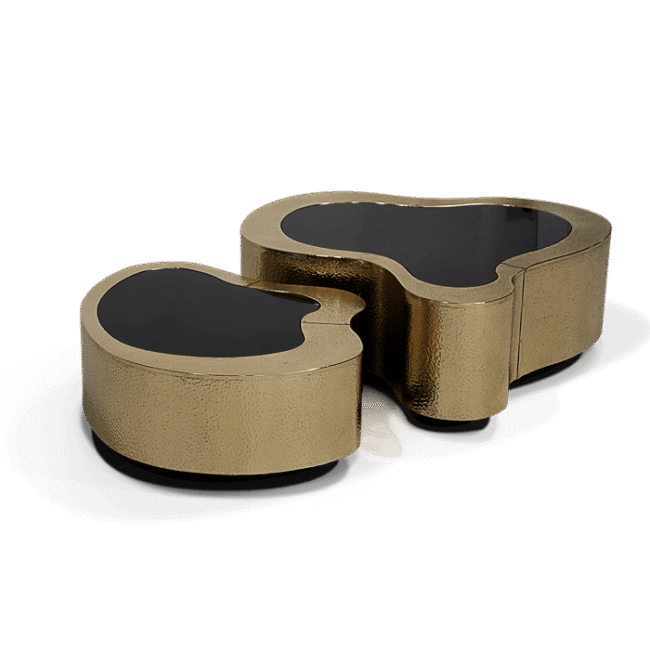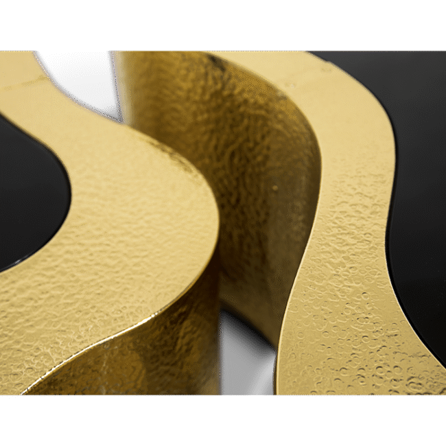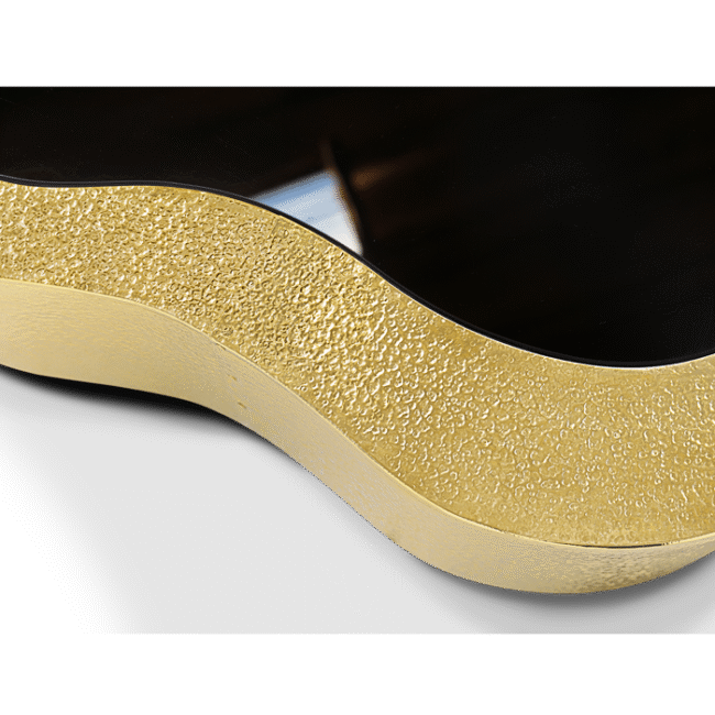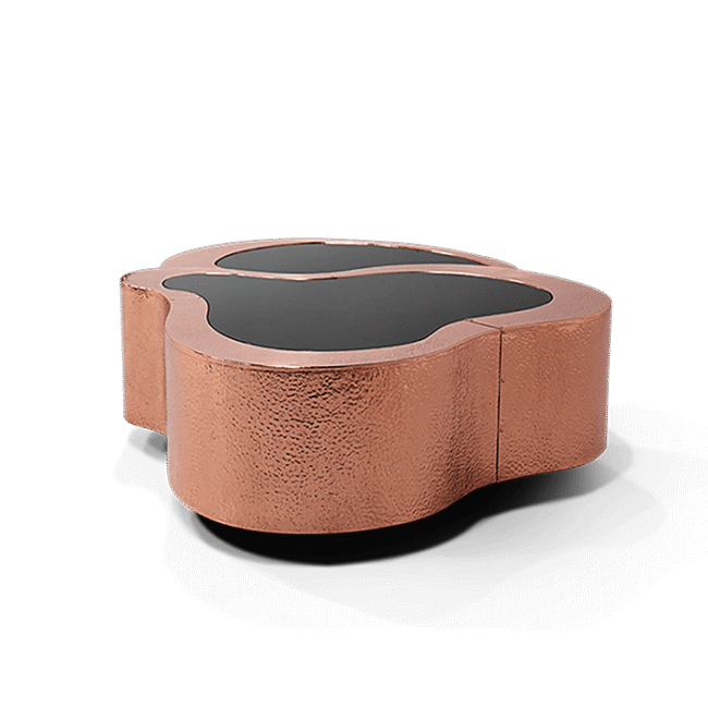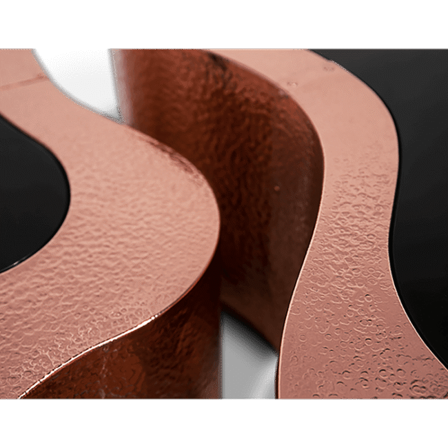 The Wave Center Table is a statement piece that draws inspiration from coastal rock formations the waves have sculpted, curving their rough shapes through thousands of years of a timed collision. Made in wood and coated in either manually hammered copper or brass, this contemporary coffee table incorporates industrious metalworking techniques that test the skill of our artisans, while the top joins a black mirror shell that emulates the accumulation of water. A black lacquered base is finished with a high gloss varnish. An elegant center table that brings a timeless touch to the most sophisticated rooms. Wave is available as a set of two tables with different shapes that suit modern sitting and living rooms alike.