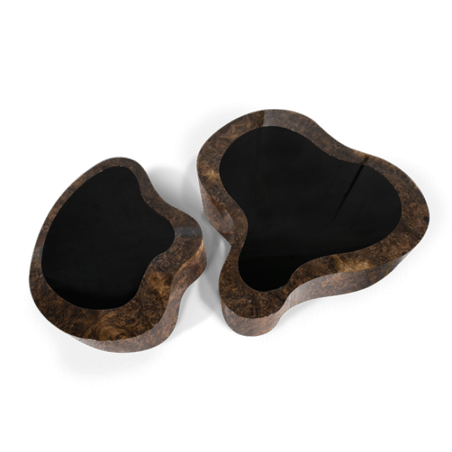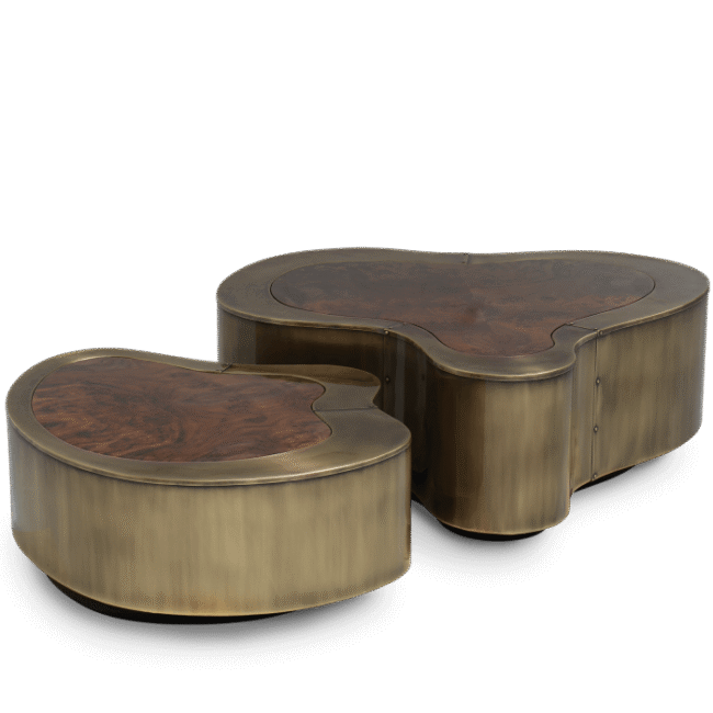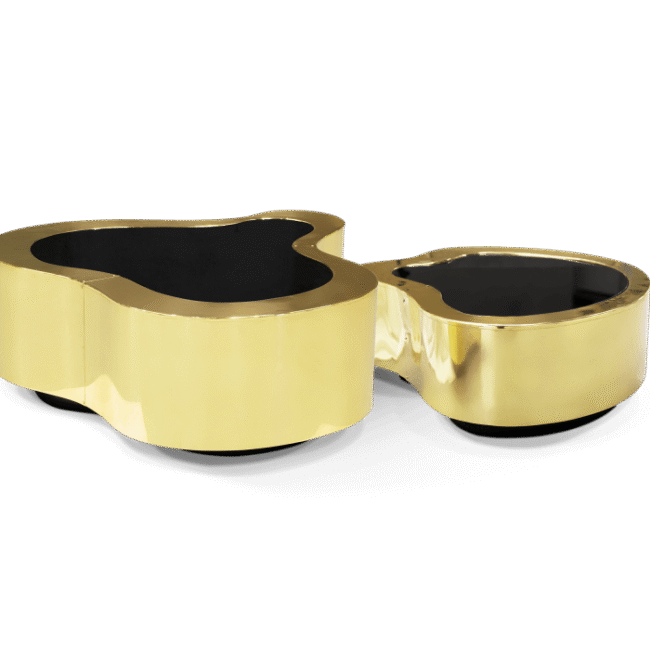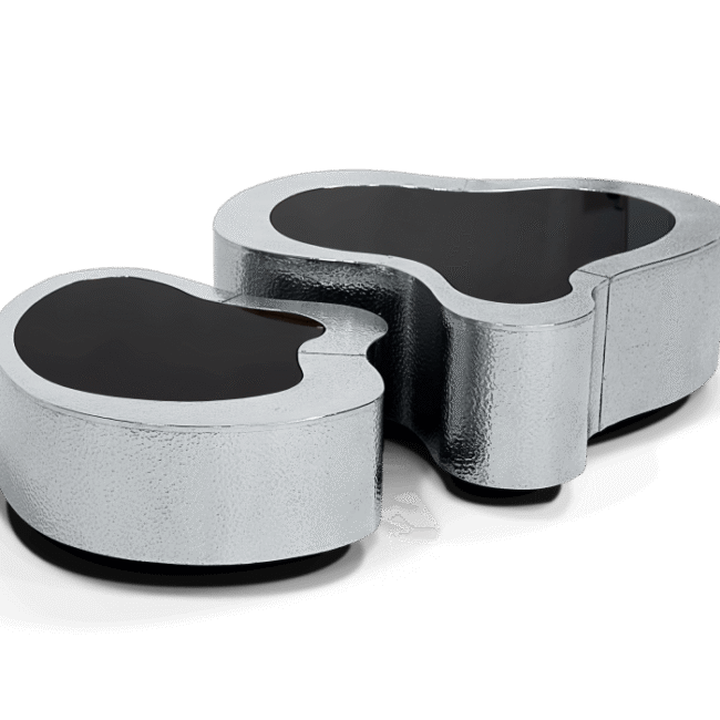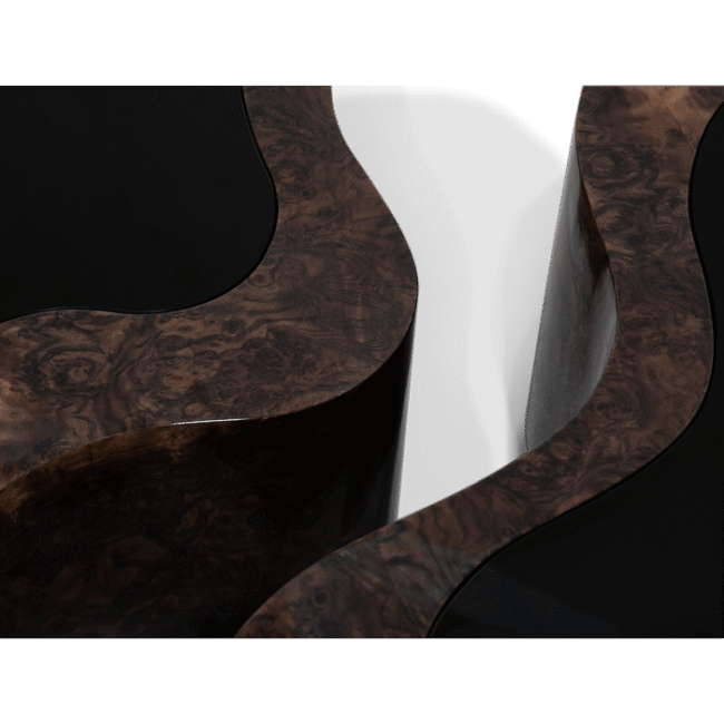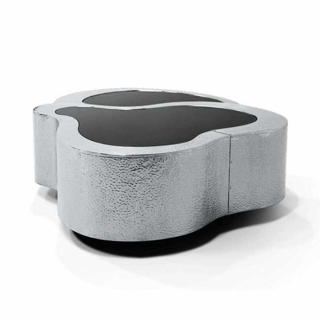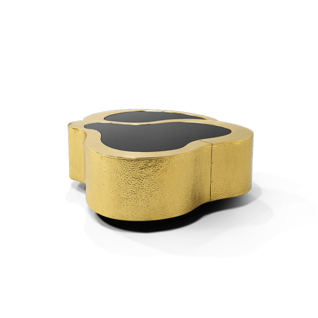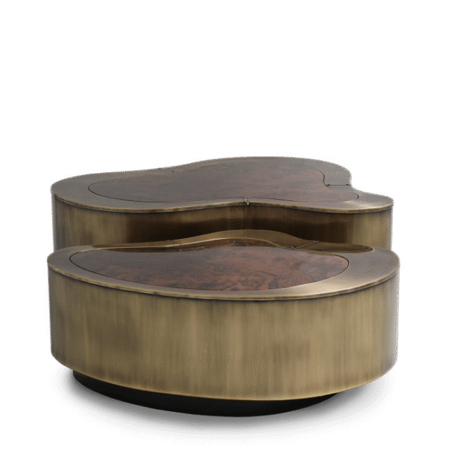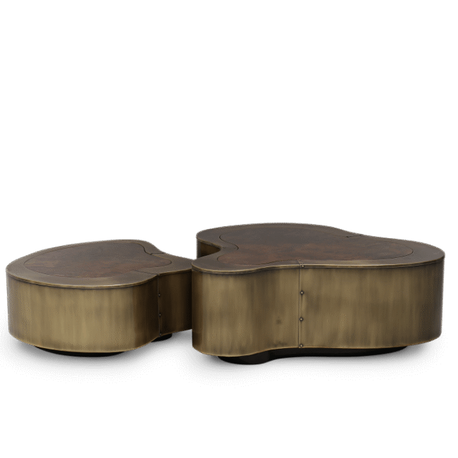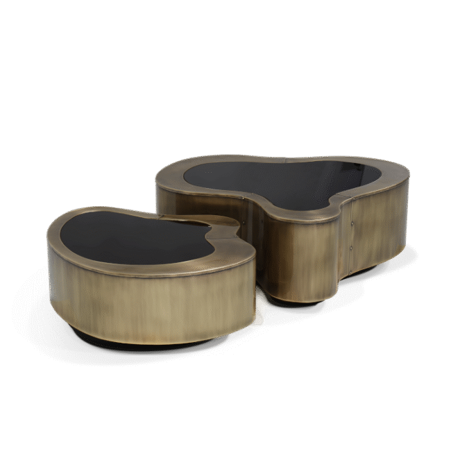 The Wave Center Table is a statement piece that draws inspiration from coastal rock formations the waves have sculpted, curving their rough shapes through thousands of years of a timed collision. Made in wood and coated in either manually hammered copper or brass, this contemporary coffee table incorporates industrious metalworking techniques that test the skill of our artisans, while the top joins a black mirror shell that emulates the accumulation of water. A black lacquered base is finished with a high gloss varnish. An elegant center table that brings a timeless touch to the most sophisticated rooms. Wave is available as a set of two tables with different shapes that suit modern sitting and living rooms alike.