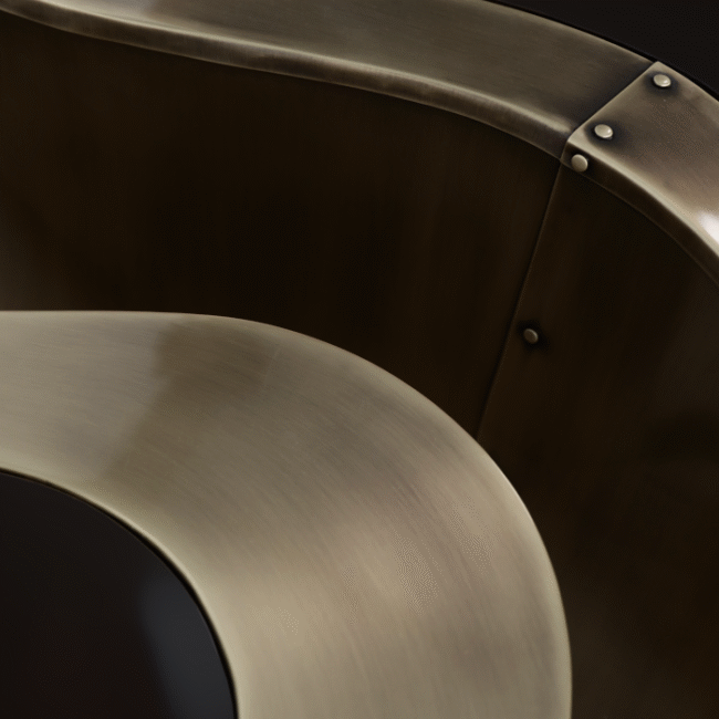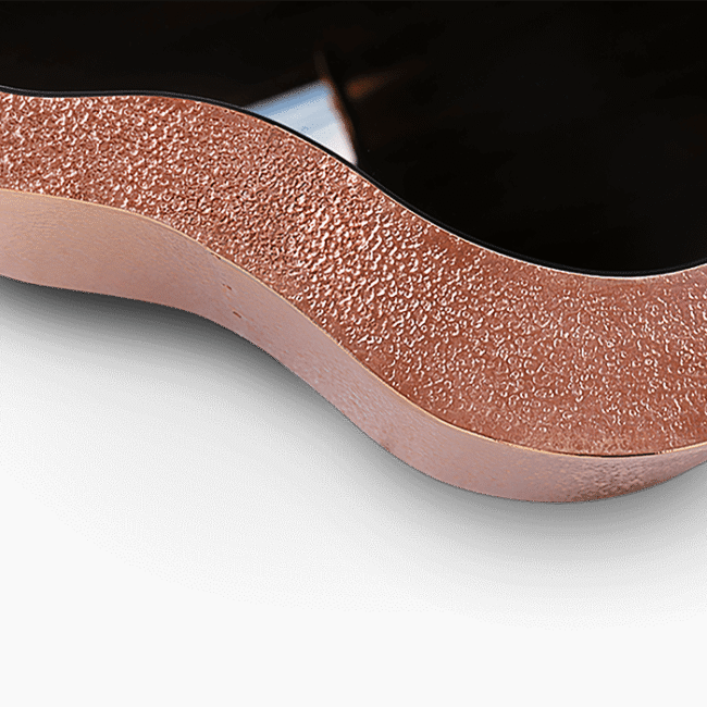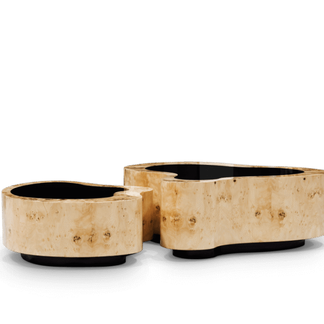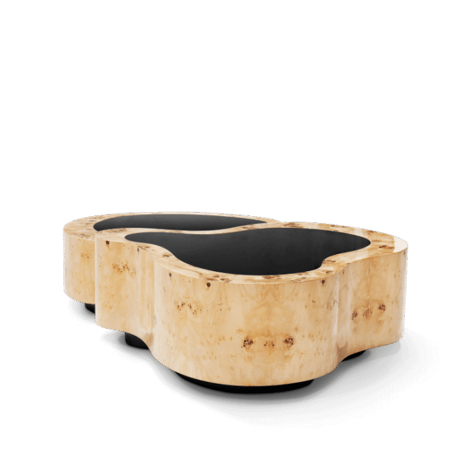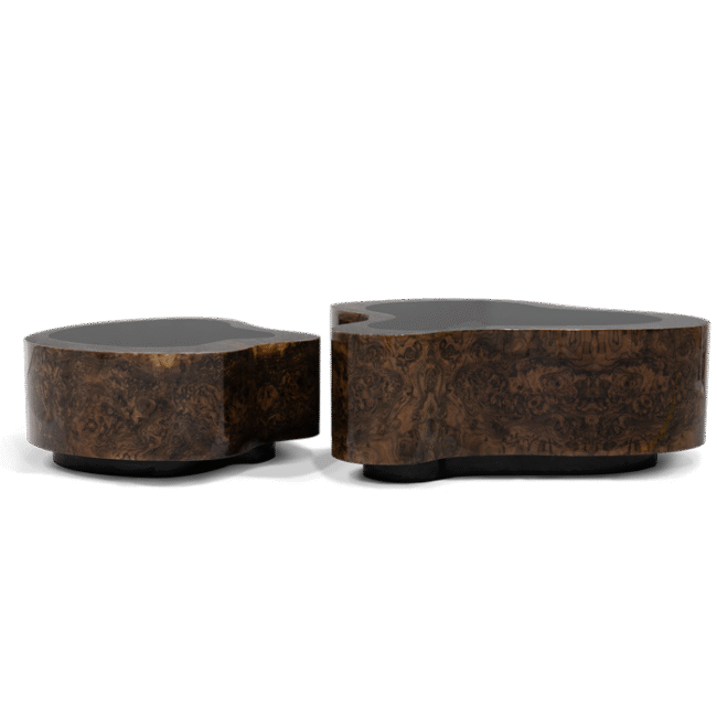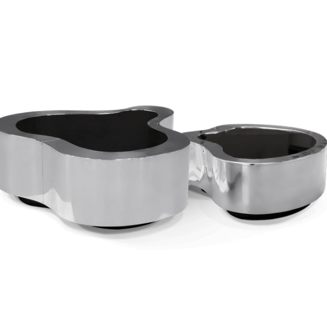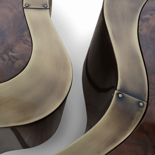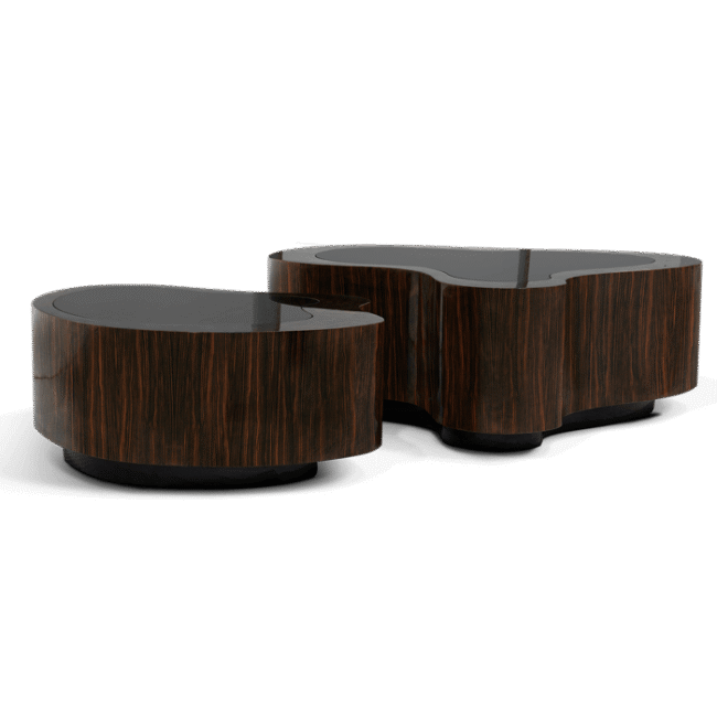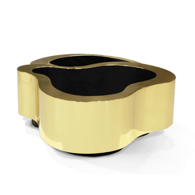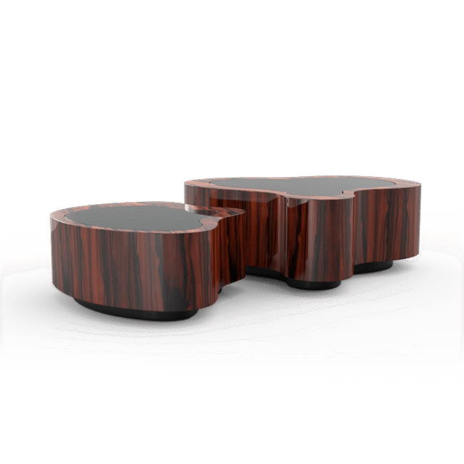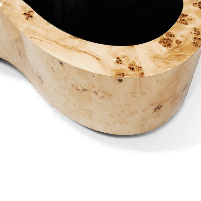 The Wave Center Table is a statement piece that draws inspiration from coastal rock formations the waves have sculpted, curving their rough shapes through thousands of years of a timed collision. Made in wood and coated in either manually hammered copper or brass, this contemporary coffee table incorporates industrious metalworking techniques that test the skill of our artisans, while the top joins a black mirror shell that emulates the accumulation of water. A black lacquered base is finished with a high gloss varnish. An elegant center table that brings a timeless touch to the most sophisticated rooms. Wave is available as a set of two tables with different shapes that suit modern sitting and living rooms alike.