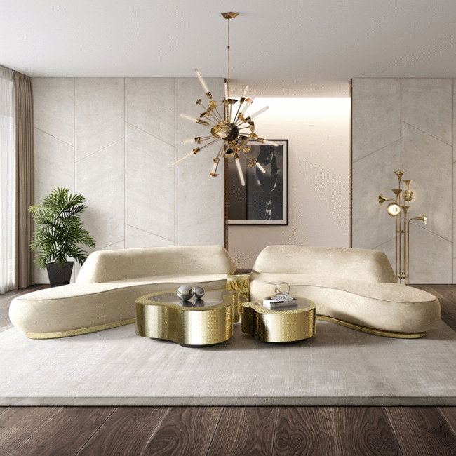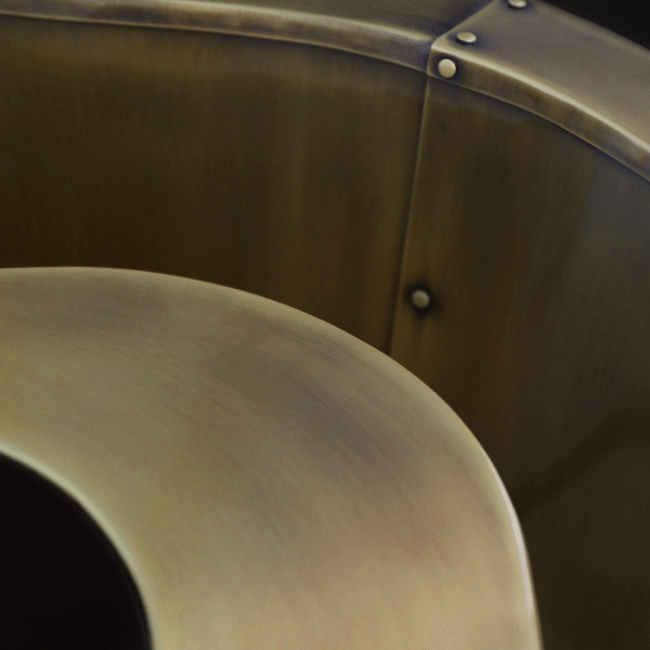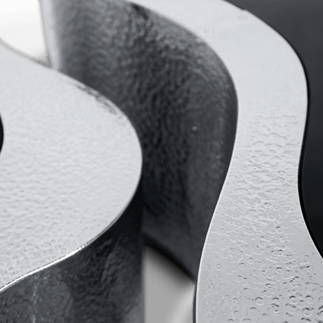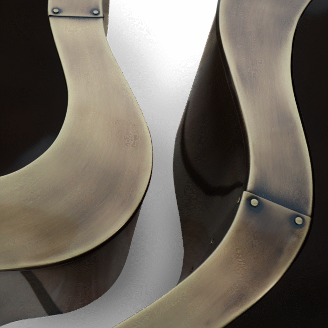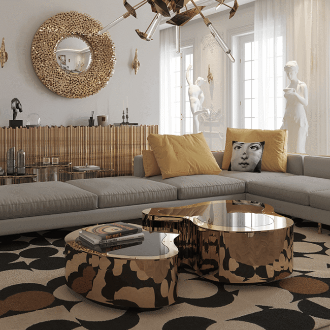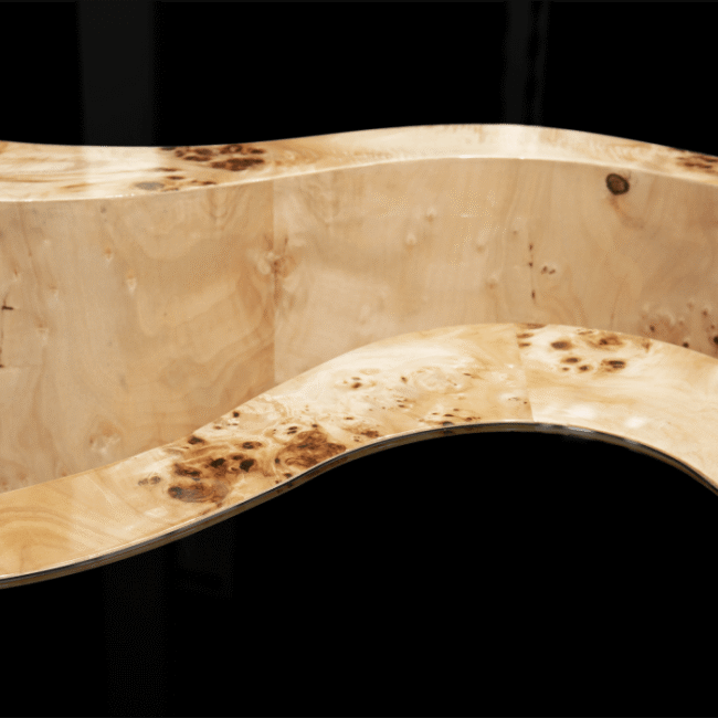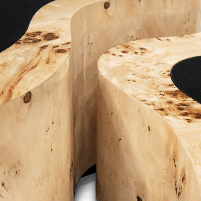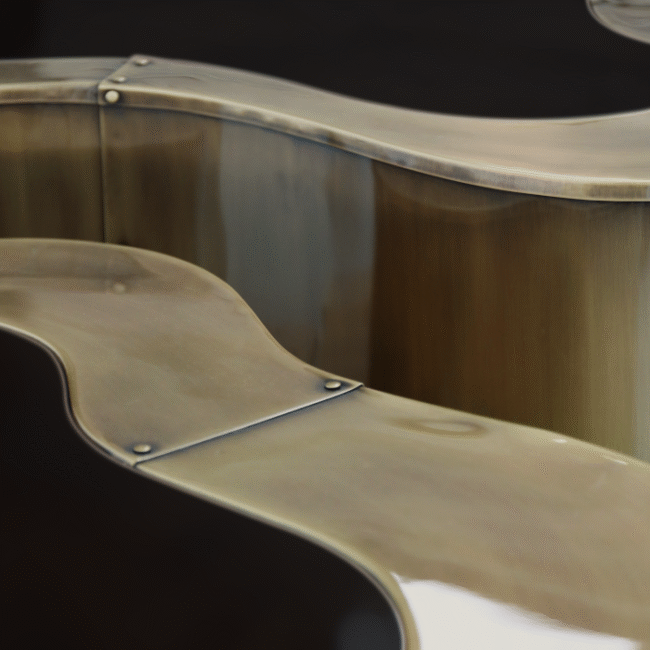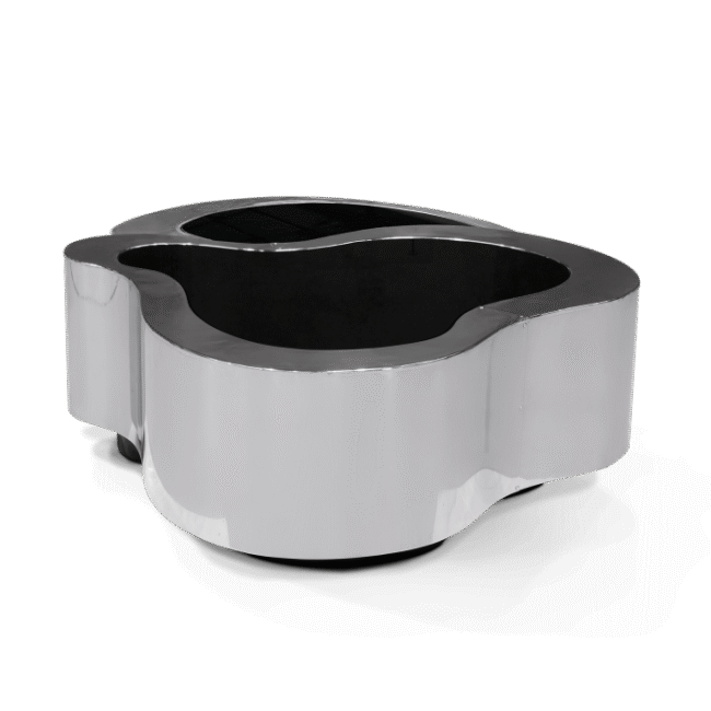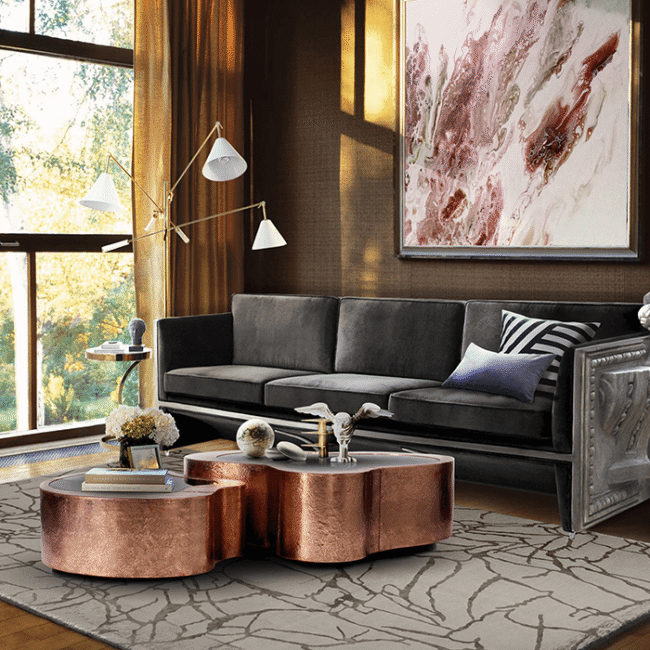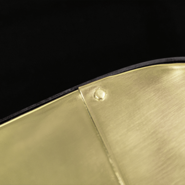 The Wave Center Table is a statement piece that draws inspiration from coastal rock formations the waves have sculpted, curving their rough shapes through thousands of years of a timed collision. Made in wood and coated in either manually hammered copper or brass, this contemporary coffee table incorporates industrious metalworking techniques that test the skill of our artisans, while the top joins a black mirror shell that emulates the accumulation of water. A black lacquered base is finished with a high gloss varnish. An elegant center table that brings a timeless touch to the most sophisticated rooms. Wave is available as a set of two tables with different shapes that suit modern sitting and living rooms alike.