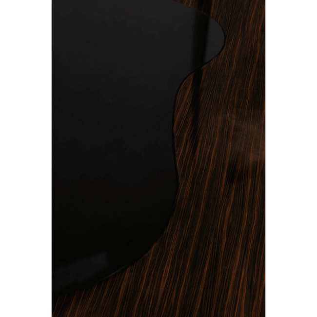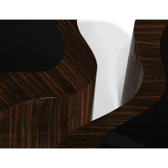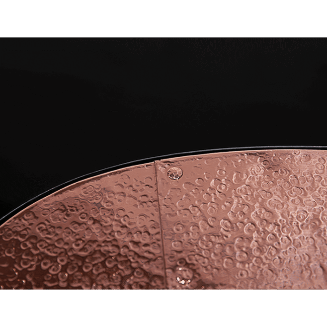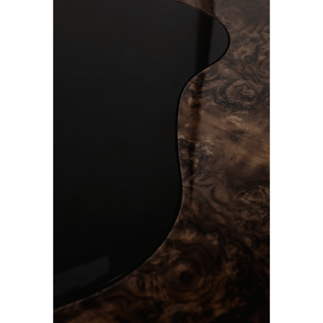 Table made in wood finished with manually hammered copper, with a curvilinear top made from black mirror. The base is lacquered in black finished with a high gloss varnish.