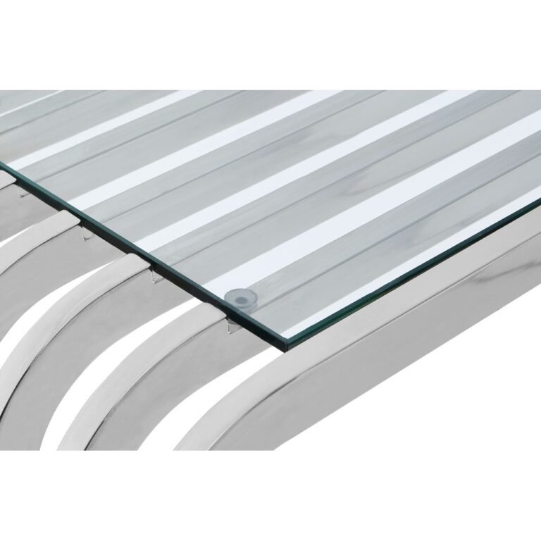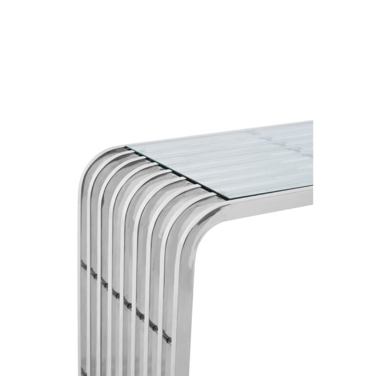 Aiste Console Table: The Aiste console table attains its sleek look thanks to its combination of clear glass and mirrored stainless steel. Its body is made up of nine slatted rows of steel that curve at the shoulders to soften its rectangular design. A pair of stainless steel rods dissects its lines at each side. Coordinate it with art-deco living room or hallway décor.