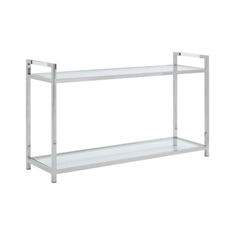 Aiste Tempered Glass Console Table: The table’s frame is made from polished stainless steel and features square edging and straight, minimal lines. Its two display tiers are made from tempered glass and are set into the frame for a flush finish. The clear glass and polished steel contribute to the table’s reflective aesthetic, complemented by the clear strips of acrylic that bridge its upper sides.