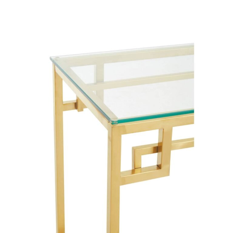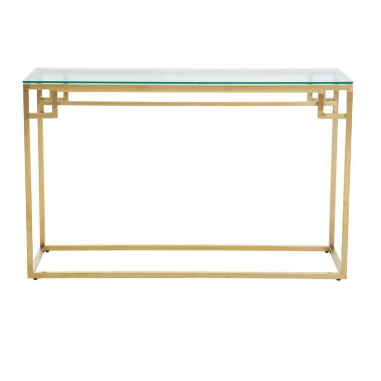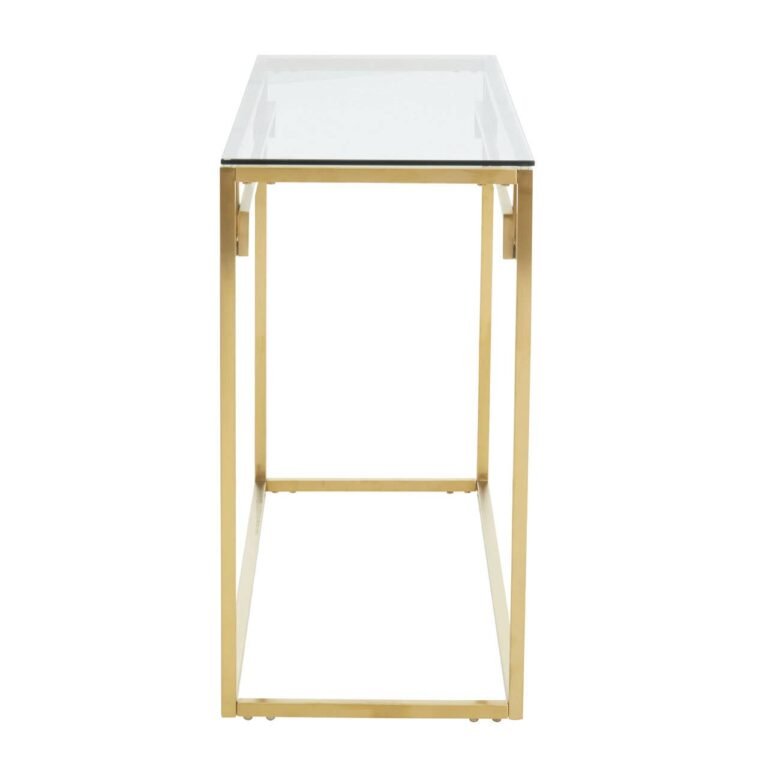 Alia Gold Brushed Console Table: Creating a chic, elegant look with this stunning gold brushed stainless steel console table featuring a gleaming finish, sleek silhouette, and a tempered glass top.