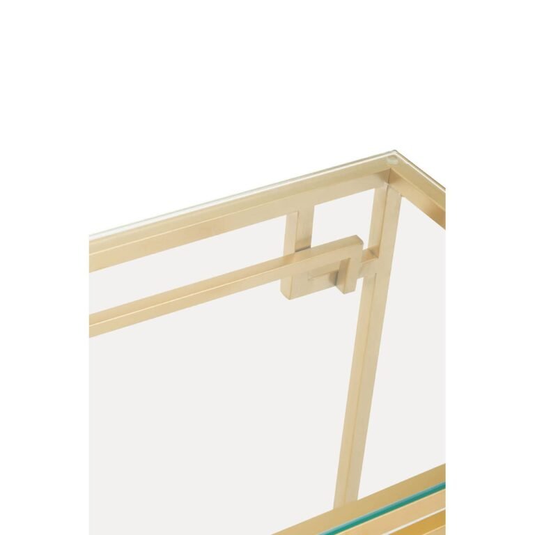 Streamlined with clean and sharp edges, this console table owns chick minimalistic aesthetic supported by an open gold brushed stainless steel frame with the table top glass. The frame is designed to withstand different conditions matching all modern aesthetics.