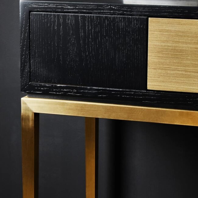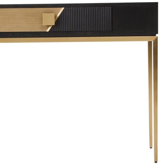 Bring a geometric effect in your room with Avioli BLACK AND GREY CONSOLE TABLE featuring two tones and diagonal designs. The grains of the grey side are subtly contrasted by the fluted black side. The console table is complemented by gold finished handle and a solid base.