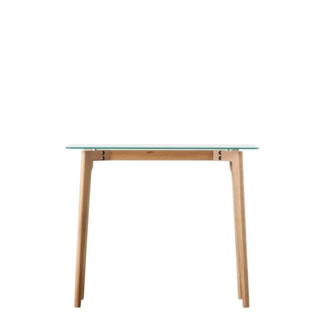 This lovely console table features a beautifully designed solid natural oak base combined with a clear tempered glass top to give a stunning contemporary look. It is part of a collection offering a range of tables, in the natural oak bases paired with clear glass and also with black oak and smoked glass.