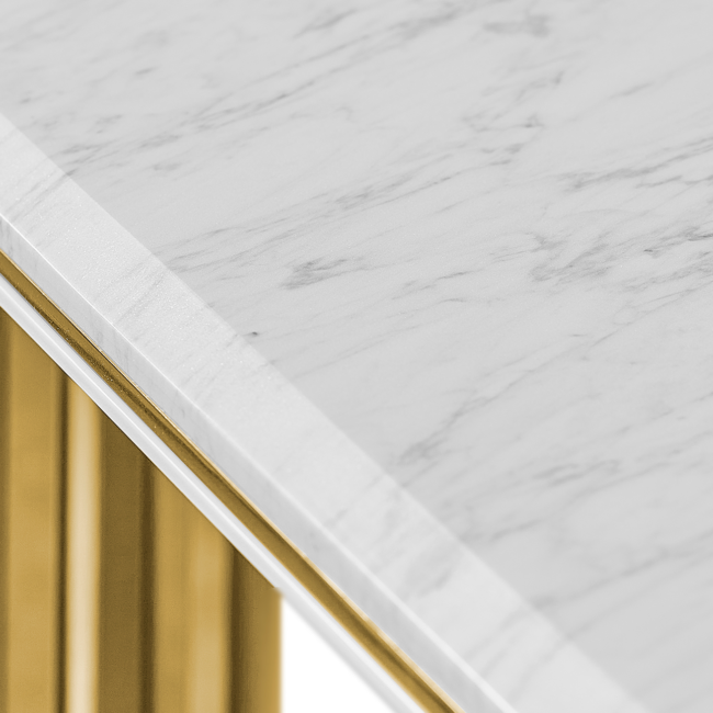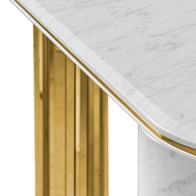 The Empire console table follows the iconic lines that the collection based on the Empire State Building is known for, but it introduces a new twist. Empire comes with a robust column and curved top made of Carrara marble, adding a regal and timeless feel. The veined nature of the marble also seamlessly matches with the metallic accents of brass, another main component of this exquisite console.