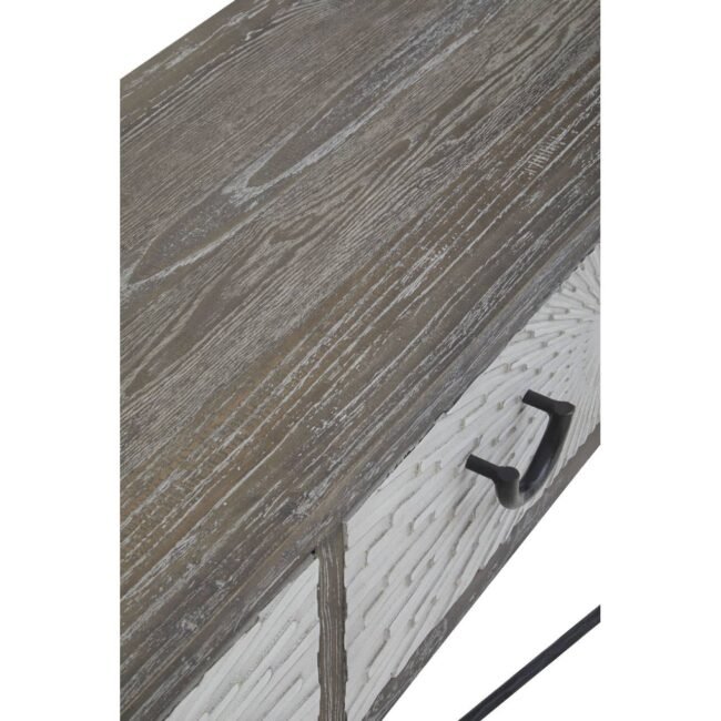 This mud grey console table has four drawers, providing ample storage space. The antique iron legs enhance the wooden texture of the table and give luxurious look to the room.