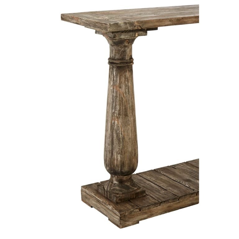 Sustainability is at the core of the Hathersage Pillar Console Table design. It is crafted from recycled pine wood, which lends distinctive grain patterns and rich textures to the classic design piece. The narrow coffee table with two shapely pillar-style legs features an attractive teak finish that lends rustic appeal.