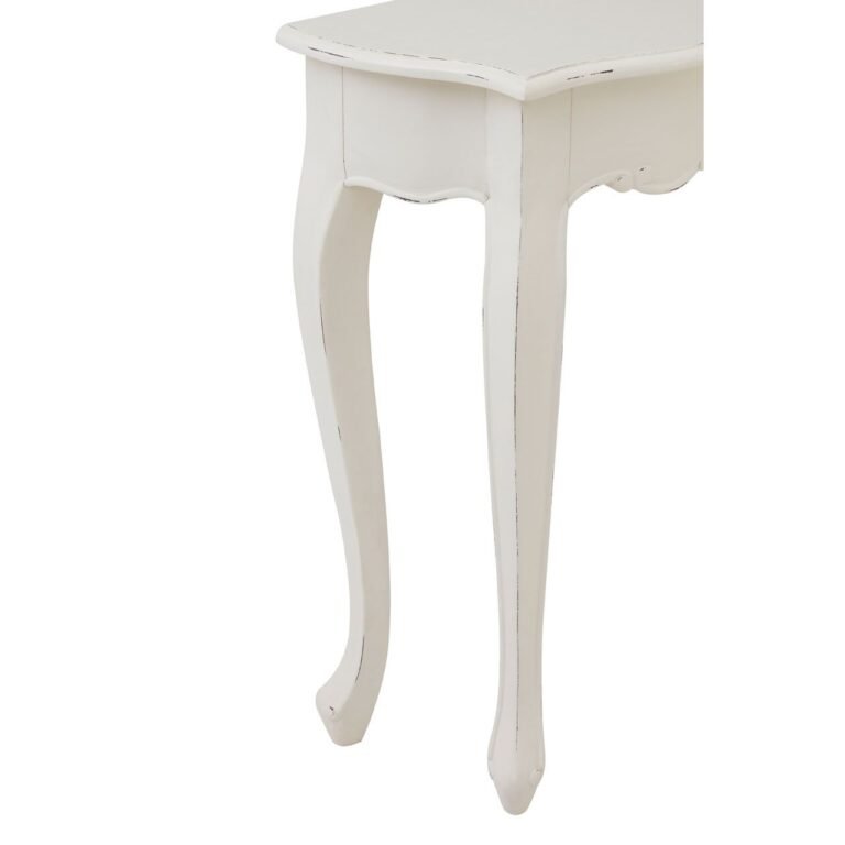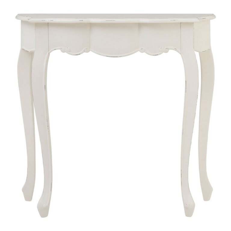 Huxley White Console Table: The Huxley console table’s white finish features weathering that accentuates its curves while giving it a slightly rustic feel. Made from bayur wood, it has a slightly coarse texture that makes it a tactile piece. Its curving legs and tabletop contribute to its sense of decorative, Regency-style refinement.