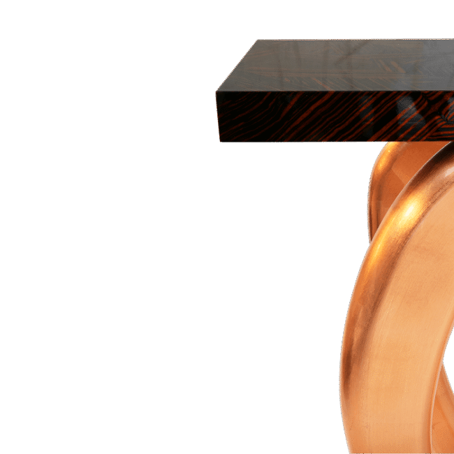 Console made from wood with a top made through ebony leaf. Its base is lined with copper leaf.