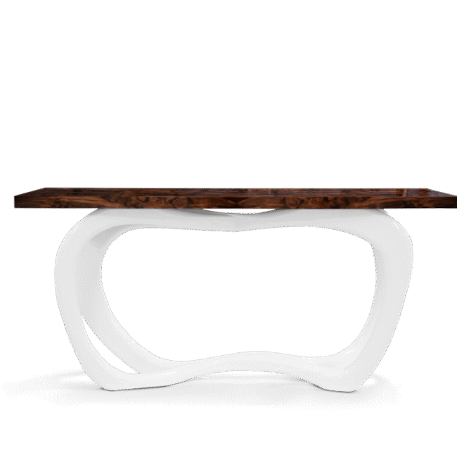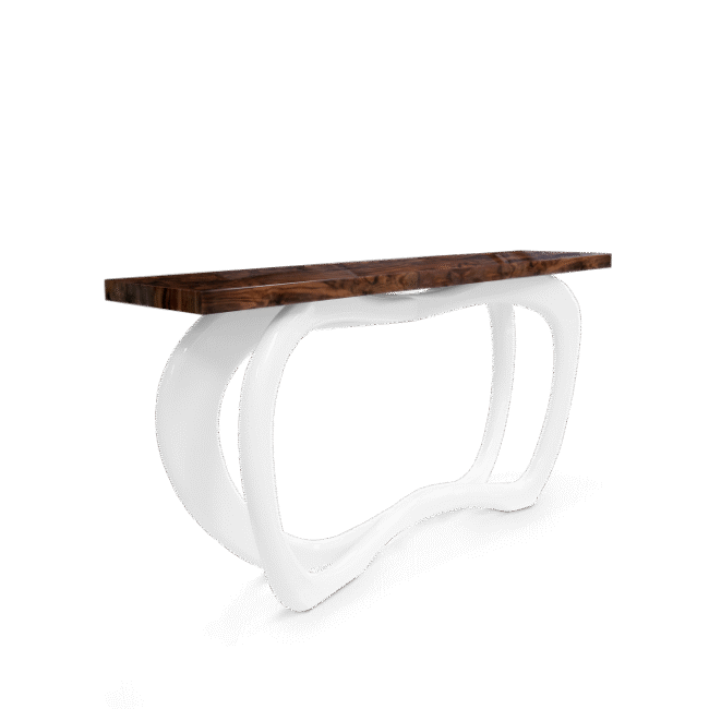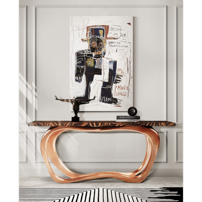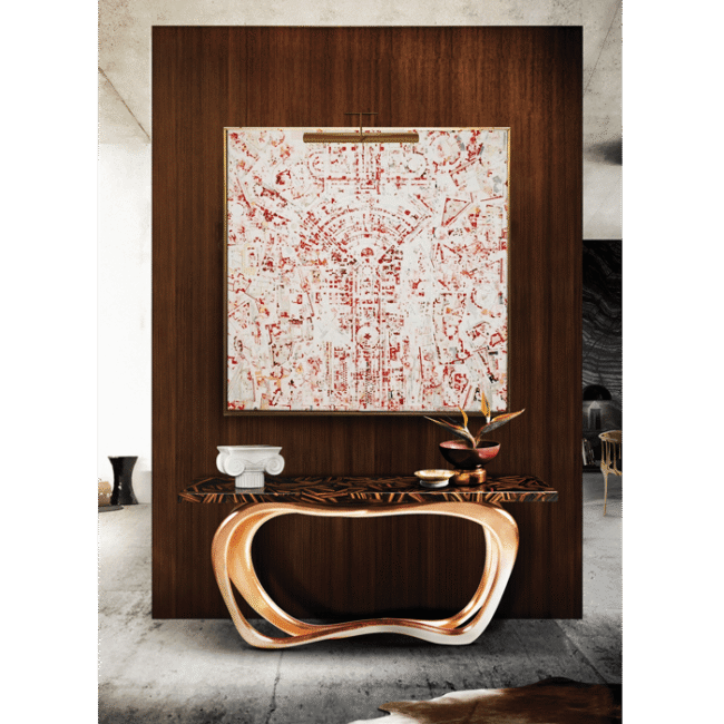 Boca do Lobo’s furniture exhales style, grace and luxury and this is certainly the case for Infinity console, a fascinating and exclusive piece, proven to be impressive and eye-catching through its sinuous and elegant lines. Infinity holds a shimmering aura that gets a classy touch to any living area. Stunning in either modern or classic entrance halls and a great addition to any living room decoration, this prodigious piece has a striking geometric mosaic wood veneer top and a copper leaf base finished with high gloss varnish.
