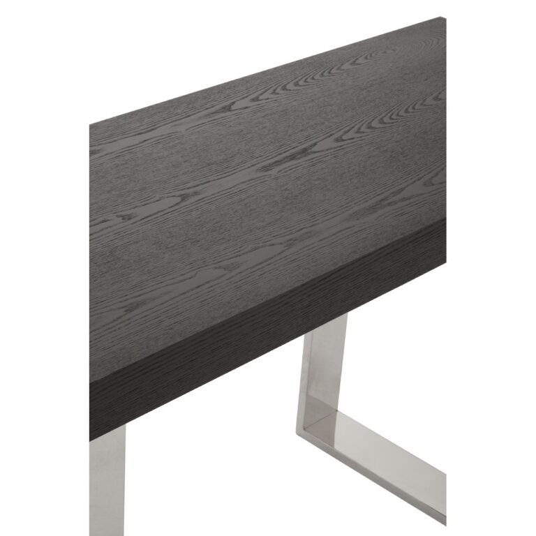 Lamus Console Table: Made from black ash elm wood, this console table has a rectangular top in rustic texture. The stainless steel U-shaped sledge base supports the sleek wooden plinth and offers an understated aesthetic.