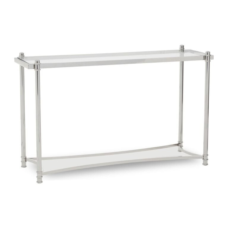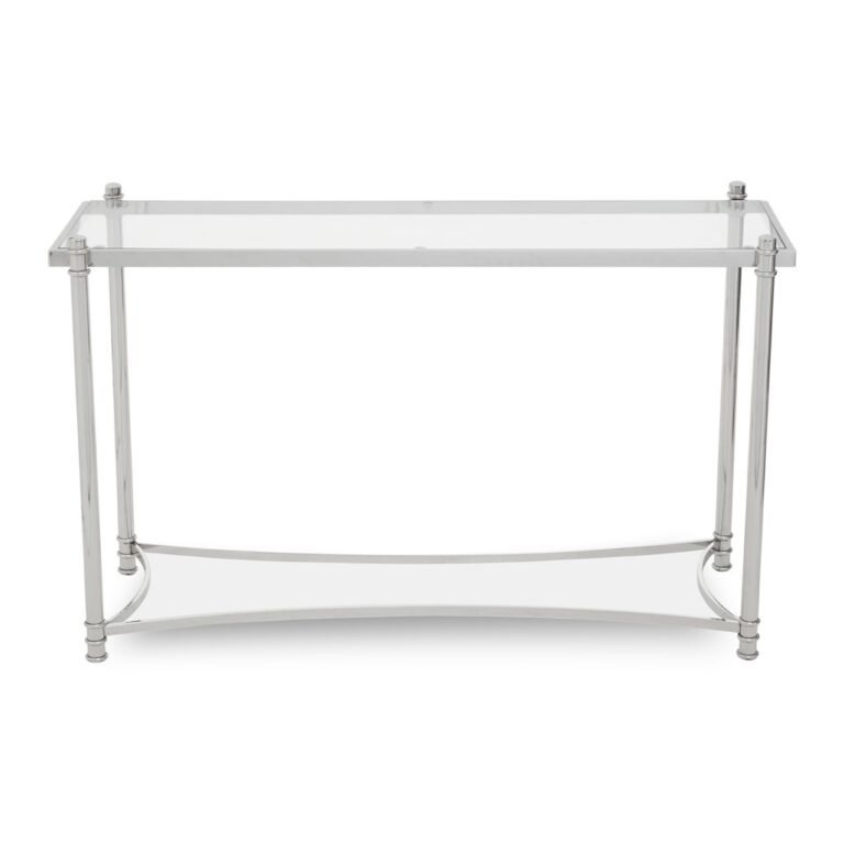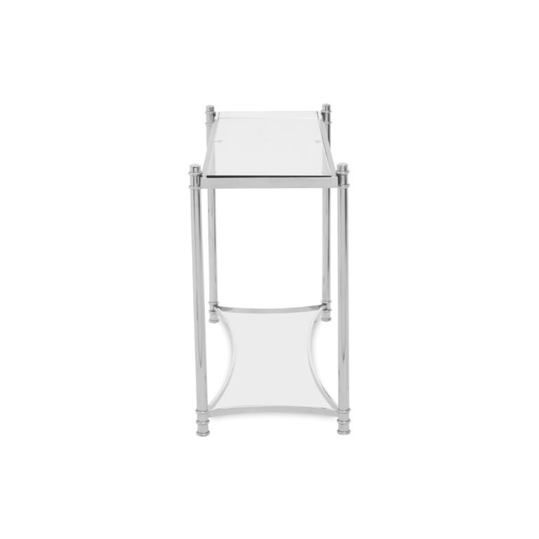The Langley clear glass console table will make a chic statement to a variety of eclectic decors with its slim profile. Elegantly crafted with robust metal and given a silver metallic finish, this console table is topped with sleek clear glass in a rectangular shape.