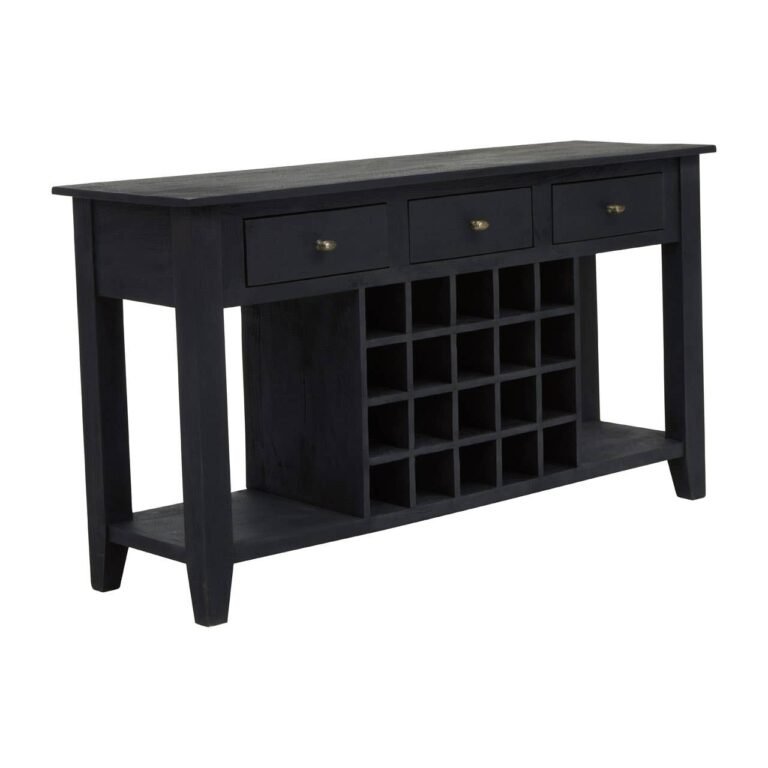 The Laniere Wine Bottle Storage Console Table has three drawers and twenty bottle of wine storage and is made from black mango wood.