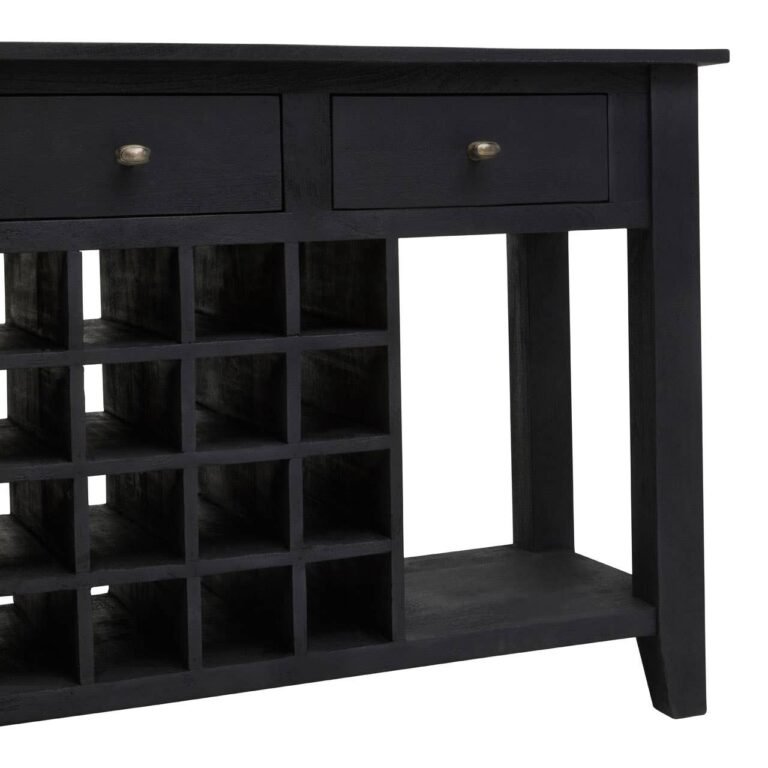 The Laniere Wine Bottle Storage Console Table is a wine lovers dream. A dramatic black mango wood frame features three drawers at the top, and space to fit 20 bottles of your finest wine.