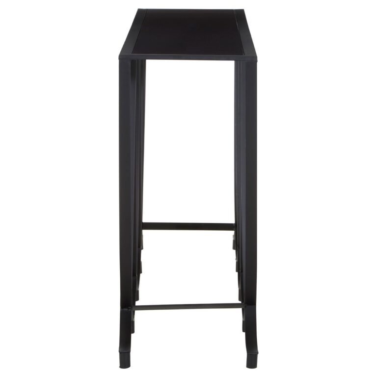 The Mossley Console Table With Black Glass Top has a black glass top that is set on its clean lined rectangular frame. The metallic, overlapped curved base gives it a distinctive look and enhances its otherwise plain aesthetic with its flowing lines. The rounded feet under these intersecting curves keep this table balanced on the floor.