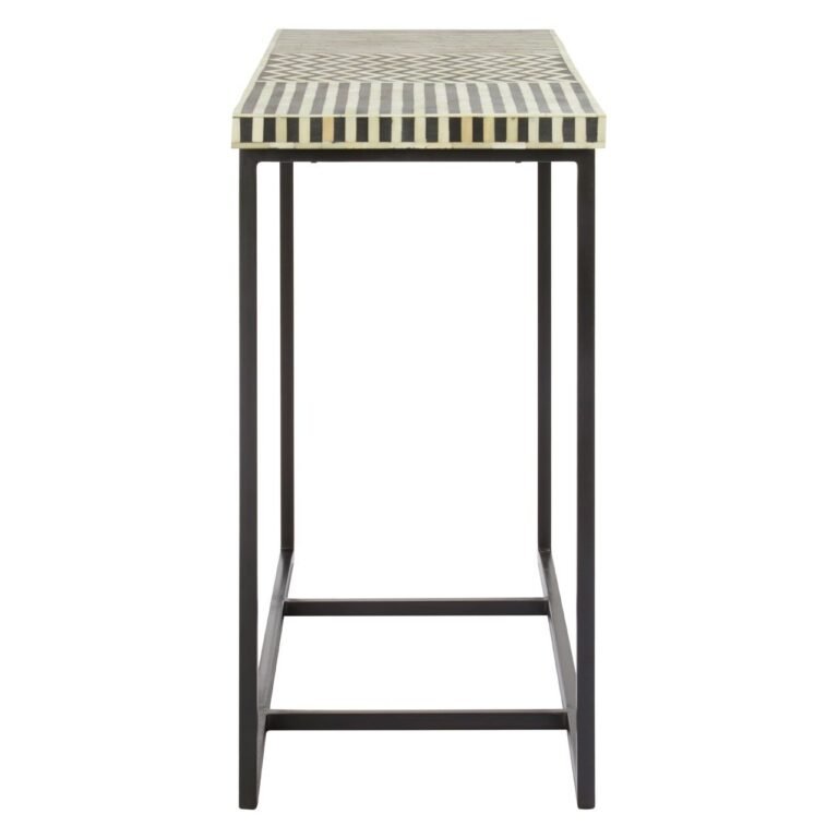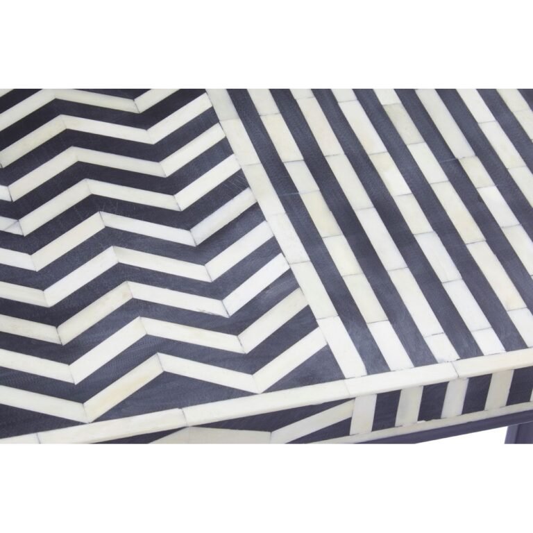 Ohom Metal Base Console Table: Ohom and travel go hand in hand and the Boho bone inlay console table is no exception to luxury and style. The black supporting metal legs hold up the renewable Mango wood which is smooth and sleek to the touch. The zig-zag and straight-lined design is detailed using bone inlay. This is all finished in a black and white design which is simple yet effective in luxurious lifestyle interiors.