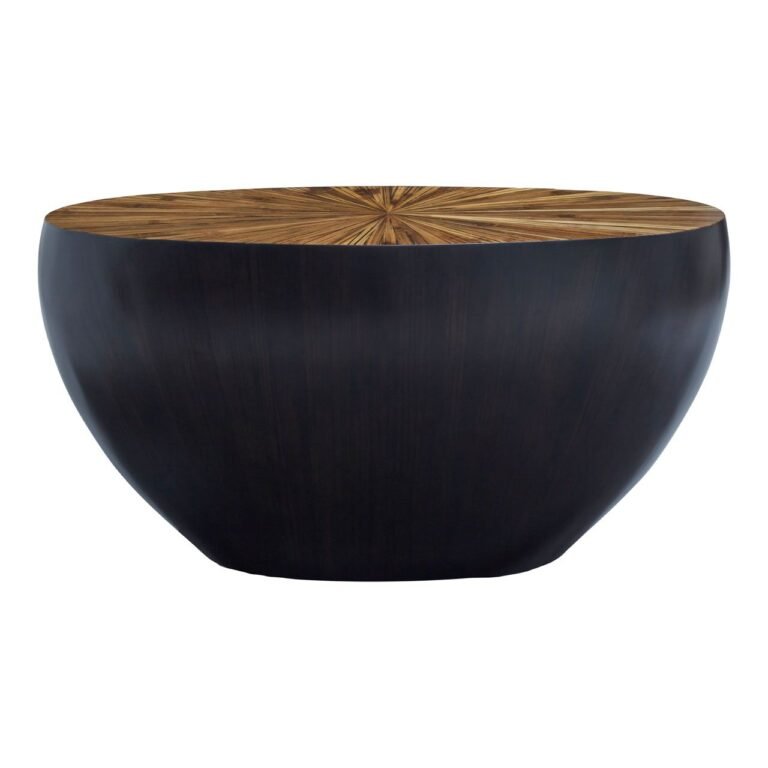 Skillfully handcrafted from renewable rubberwood, this Rabo Console Table features a smooth, rounded design. The minimalist, polyurethane finish base is contrasted with ebony bamboo top in a stunning starburst pattern.