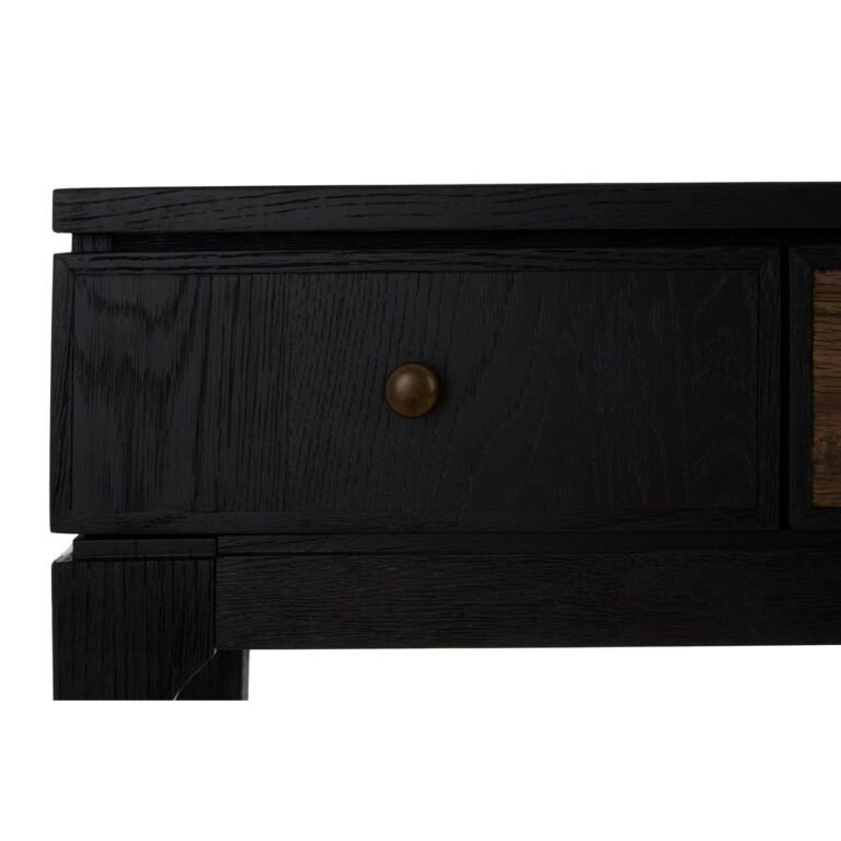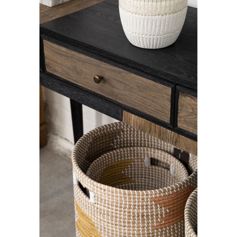 Crafted from renewable oak wood, this Railver Console Table features clean lines which contribute to its visual appeal. Finished in black, it has two small side drawers that tonally contrast with natural finish of the wide centre drawers. This boho-inspired statement piece adds colour and form to the hallway or living room.