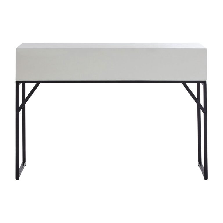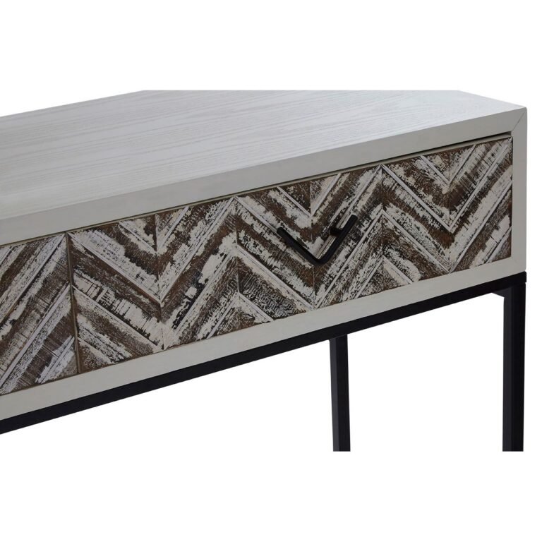 Regal 2 Drawer Console Table: This rectangular console table features two drawers which are decorated by a geometric pattern combined with a hint of weathered effect. Its top section rests on two metallic sled legs which are given an additional angular support at the rear. Each drawer provides an ample storage for small items and can be easily opened with a handle.