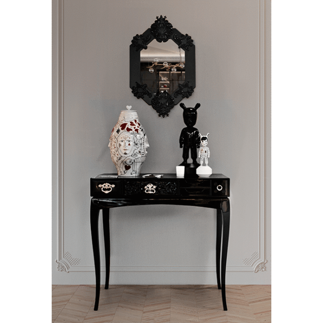 Soho is a modern console created as a tribute to Soho Sideboard. This design piece presents a collection of wood drawers with mirror and black glass.