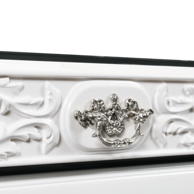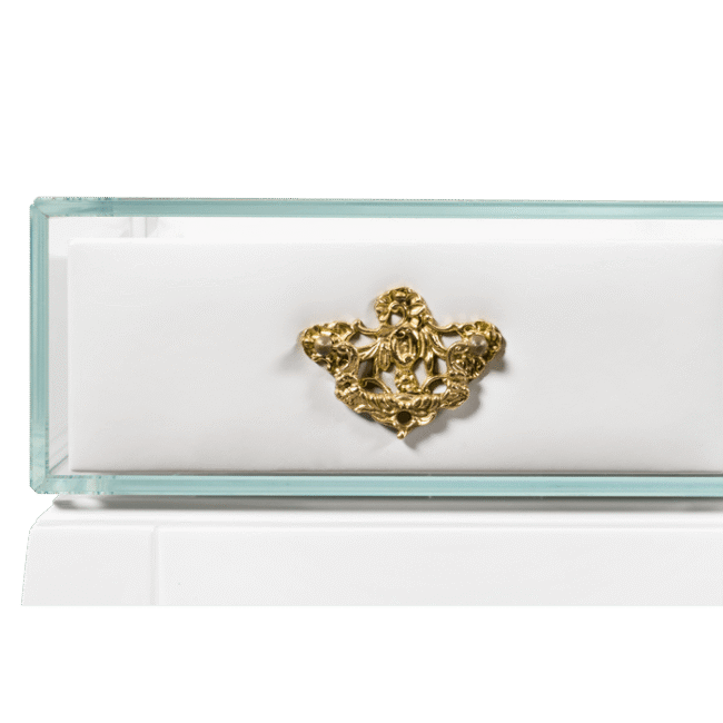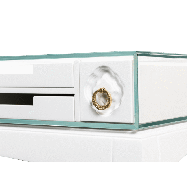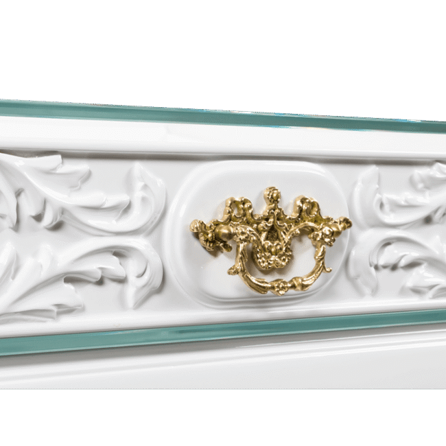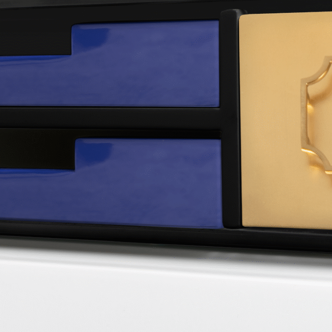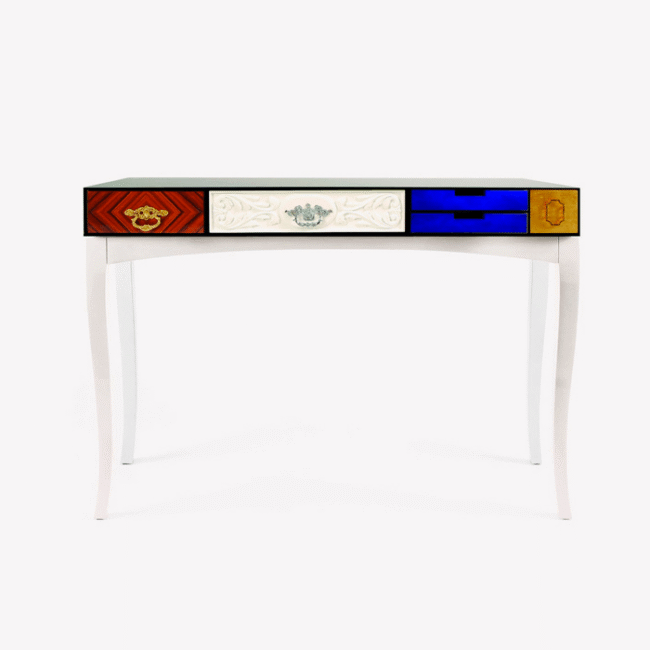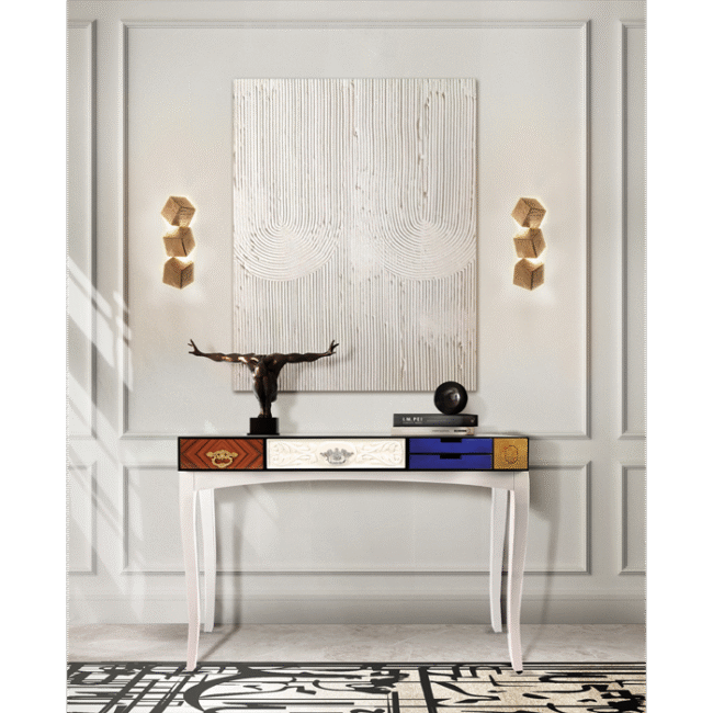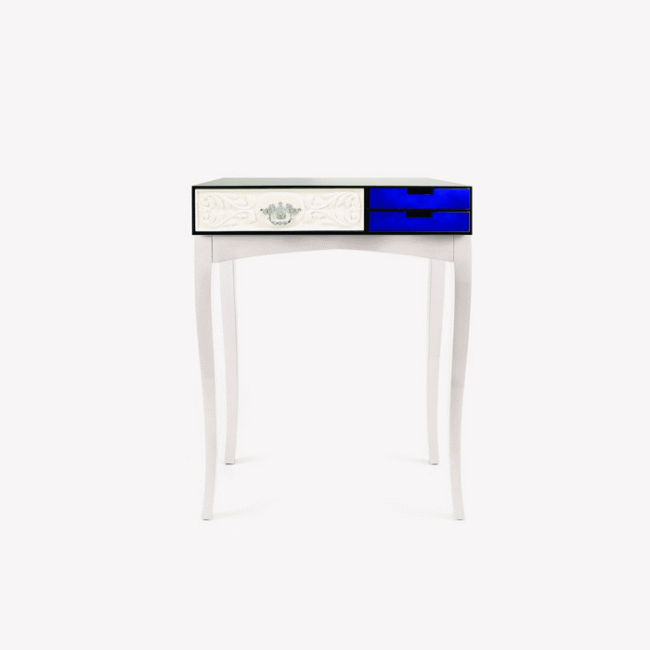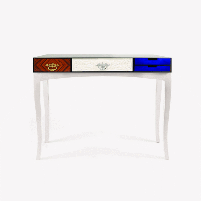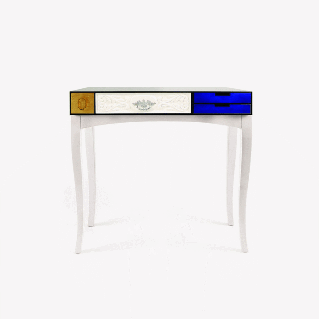 This console bases is made from wood and tempered glass and 5 drawers compose it. Its base is made in lacquered wood. It contains drawers with: handcrafted fronts lacquered in white; fronts made in maquetry and brass handles; fronts with golden leaf and fronts lacquered in blue.