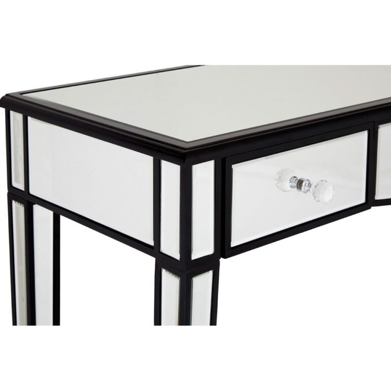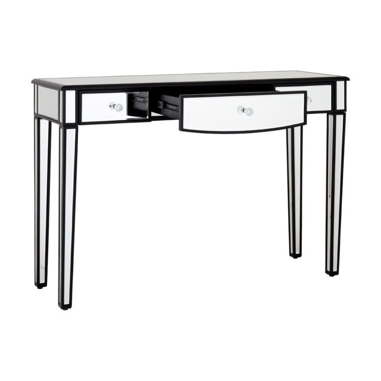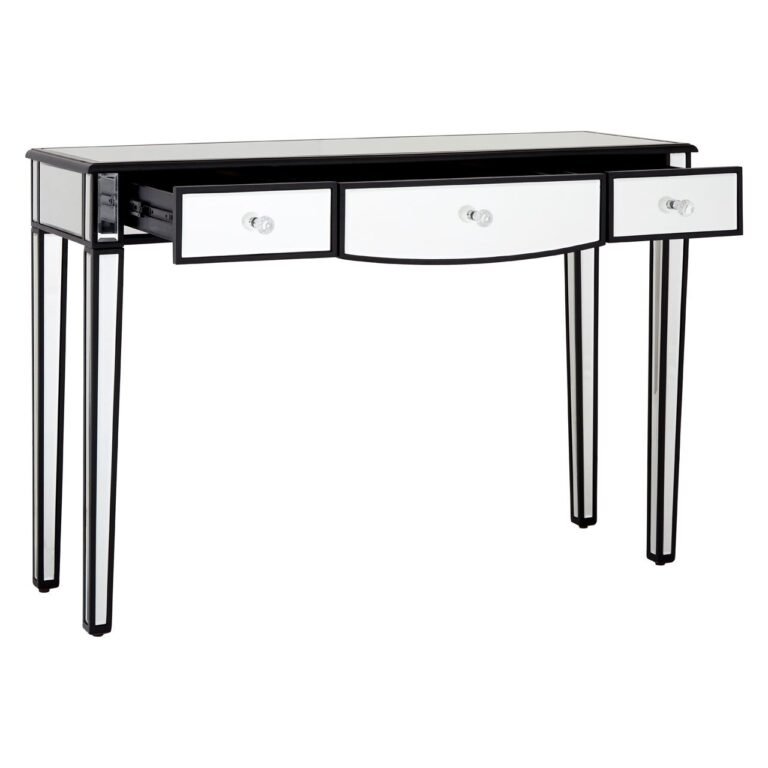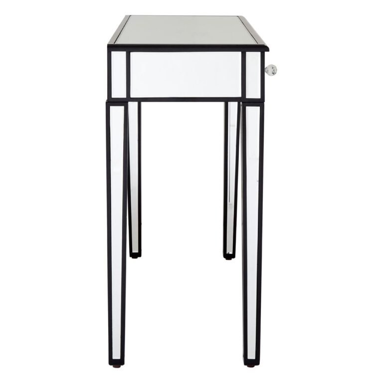 Wendy Console Table With Mirrored Frame: Three modest drawers feature elegant faceted handles that enhance the table’s luxurious aesthetic, while the middle drawer’s arched bottom counterpoints the rigid design. Black outlines add a striking contrast to the console table’s mirrored finish and add a sense of depth to this contemporary accent piece.
