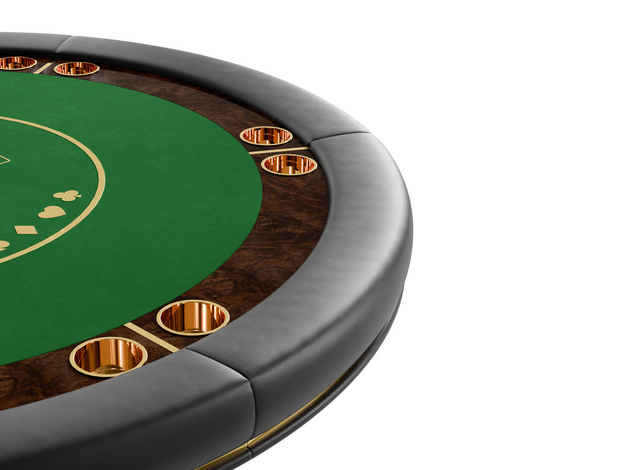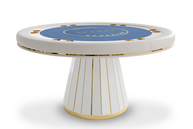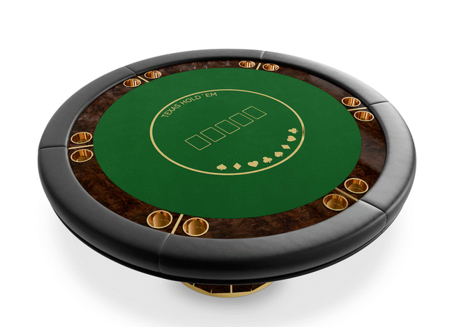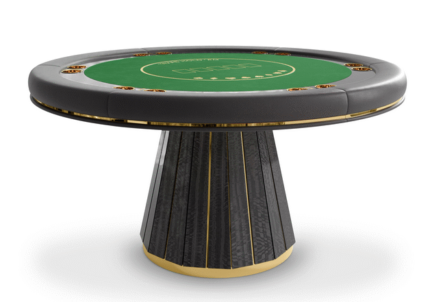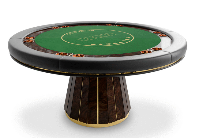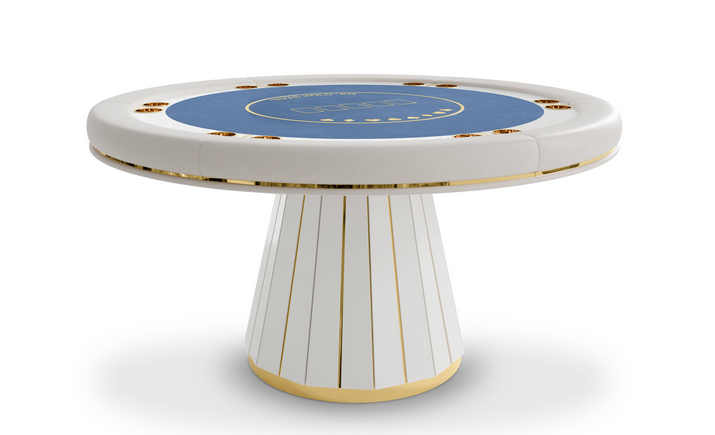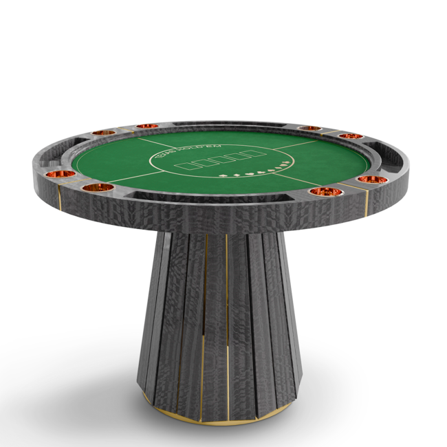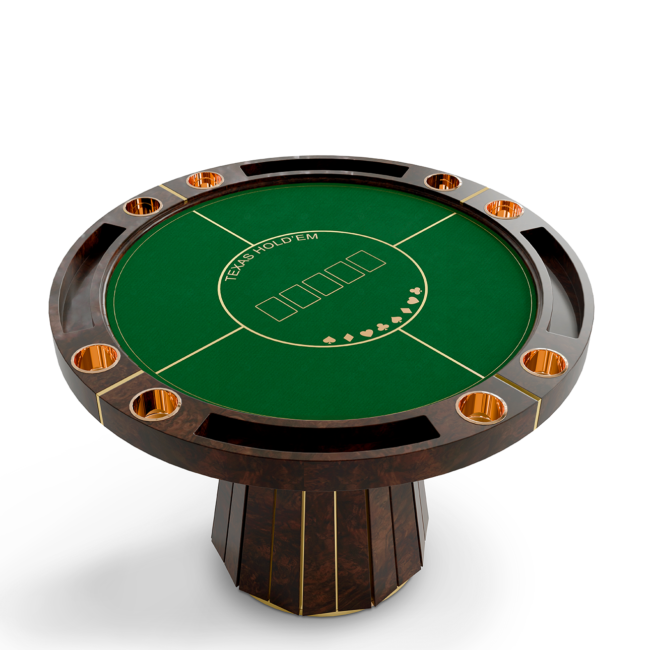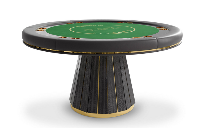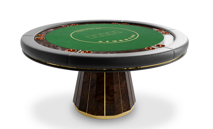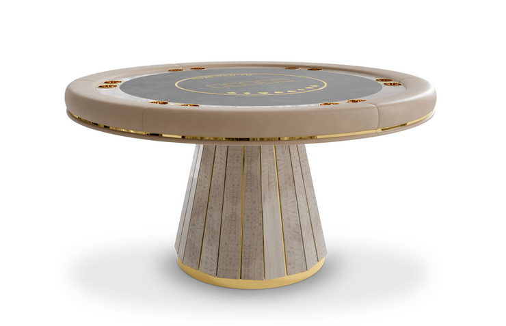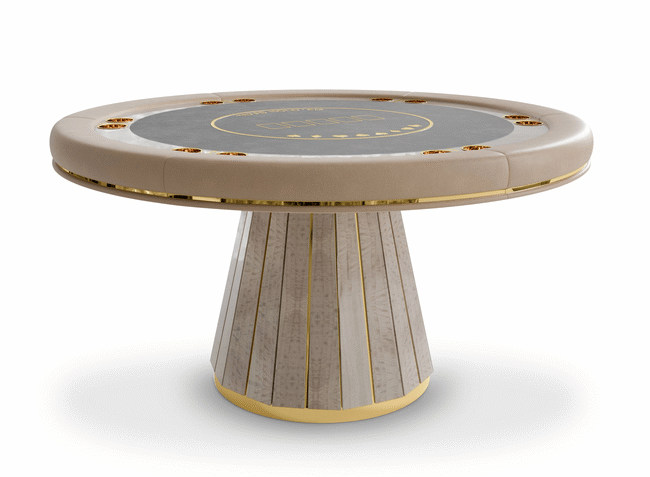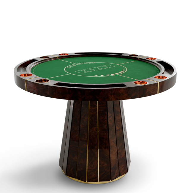 The Darian poker table is a sturdy and refined solution for any entertainment or gaming environment. This exclusive design features a classic rounded shape perfect for a good old poker get-together. It showcases phenomenal craftsmanship with a wooden build and sublime polished brass details.