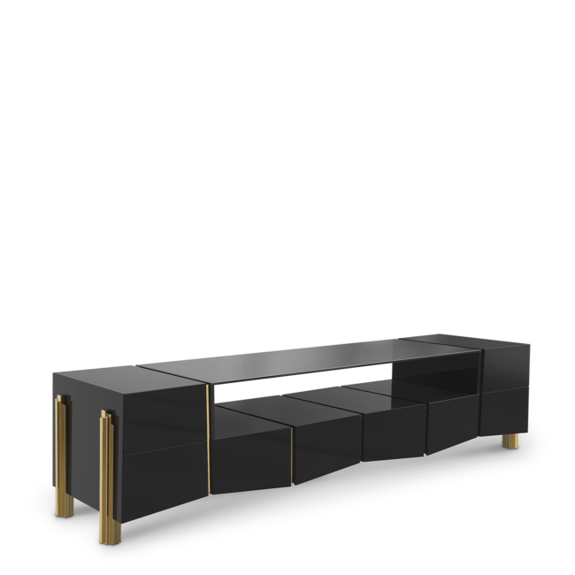 The Darian TV Cabinet was inspired by a classic line of LUXXU’s furniture. It is a sumptuous piece that blends the splendour of art with a strong personality. Featuring polished brass asymmetrical bars and a wood structure in black lacquer and smoked glass, it harmoniously combines powerful design elements while maintaining a clean and sophisticated vibe for any TV room.