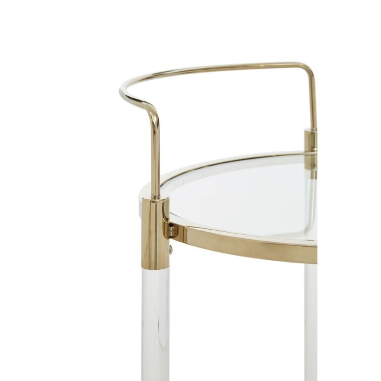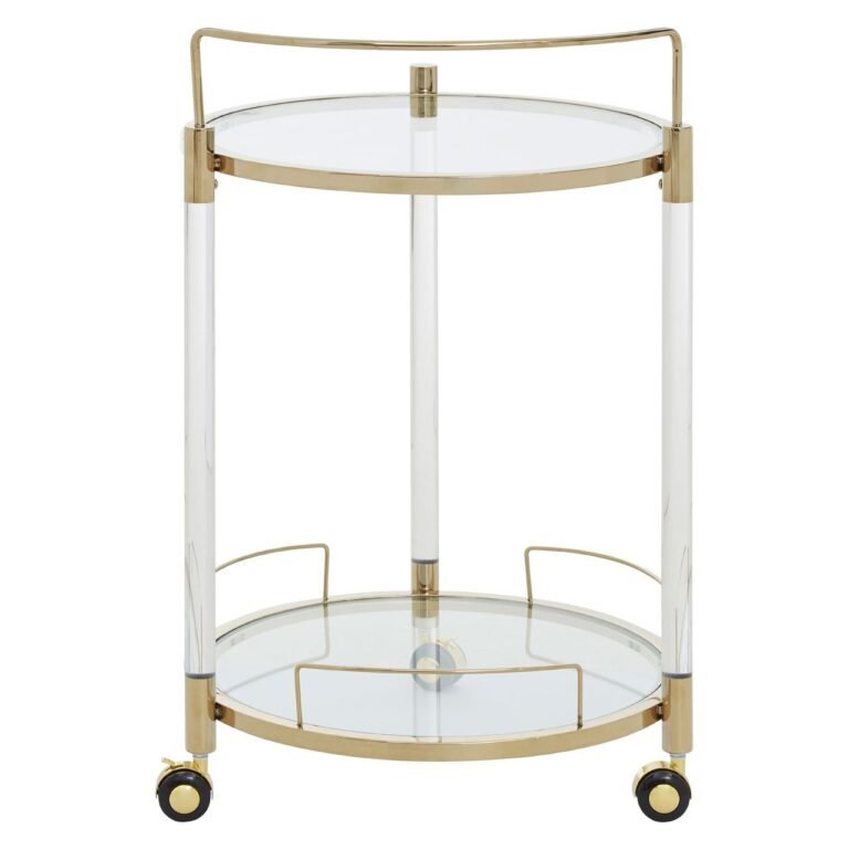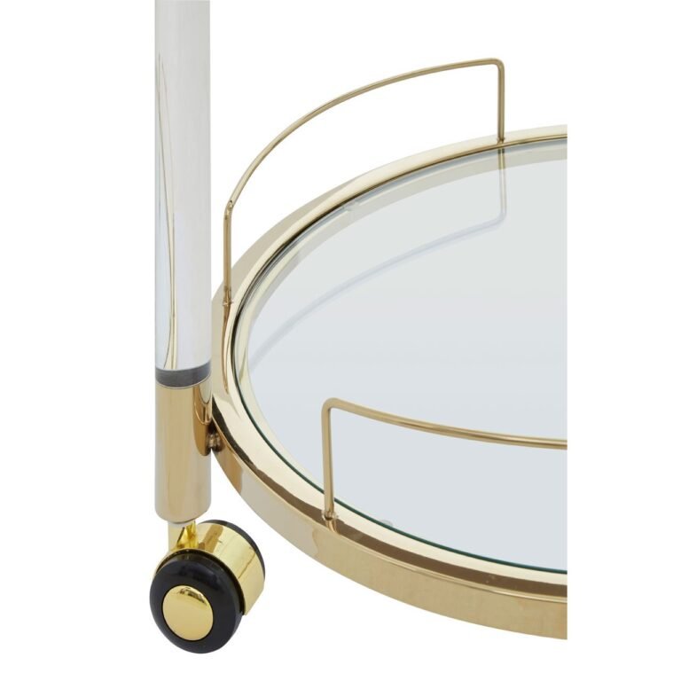 Lynwood Round Trolley: Crafted of acrylic and stainless steel with a lustrous gold finish, this practical and stylish trolley on castors has a mirrored glass lower shelf and tray top. This trolley is ideal for serving cocktails, afternoon tea and more.