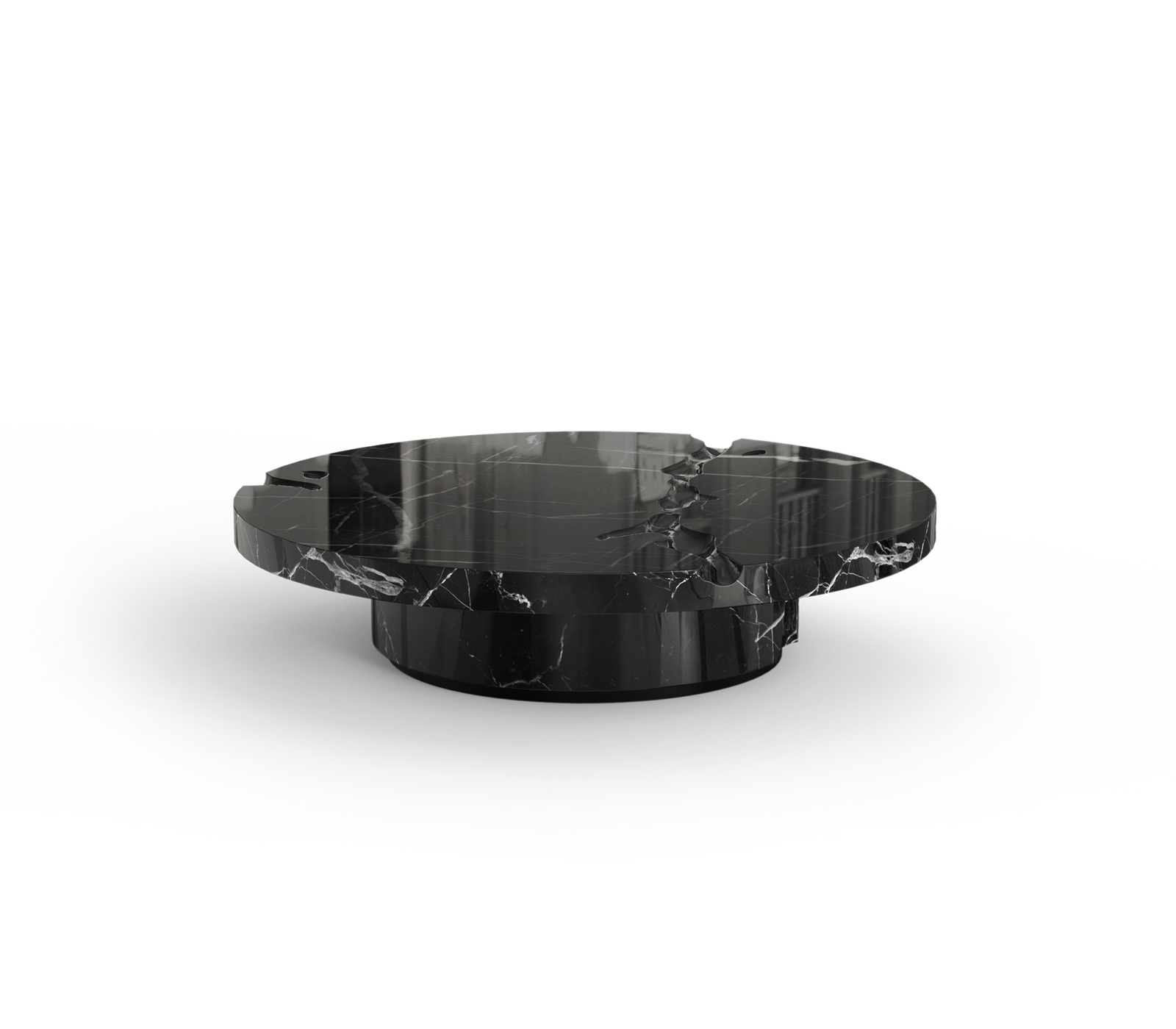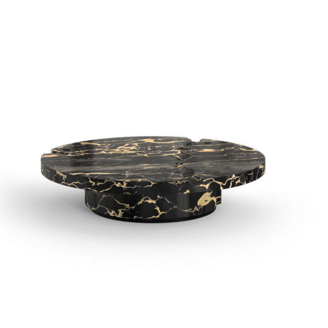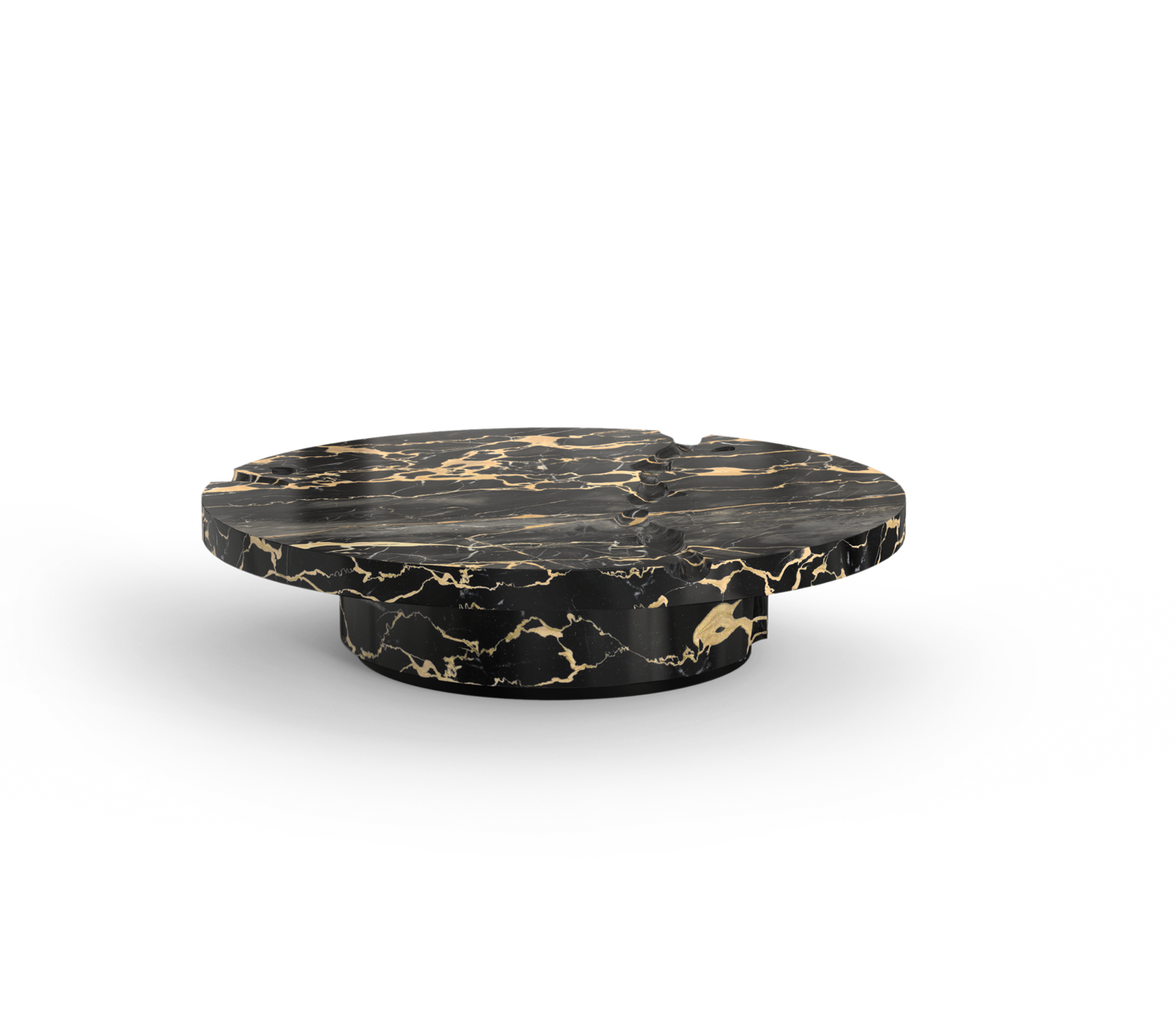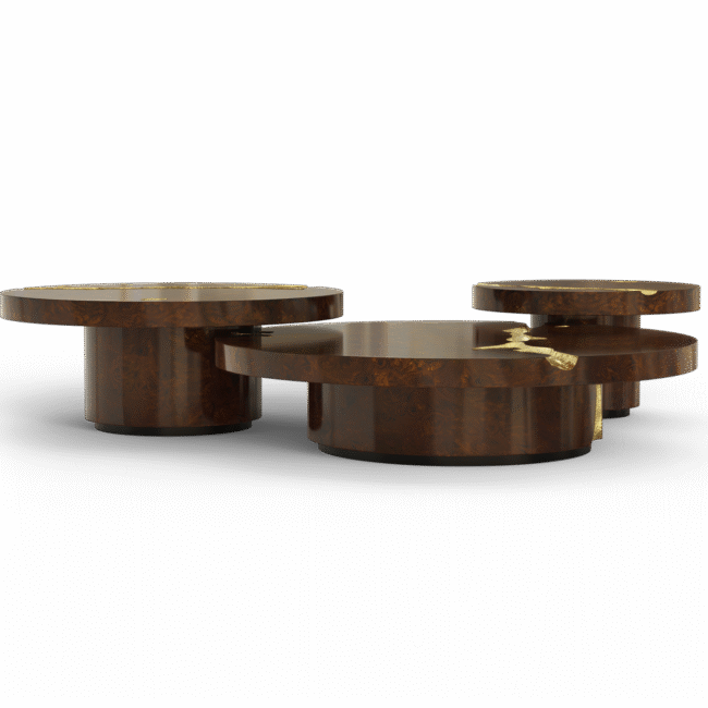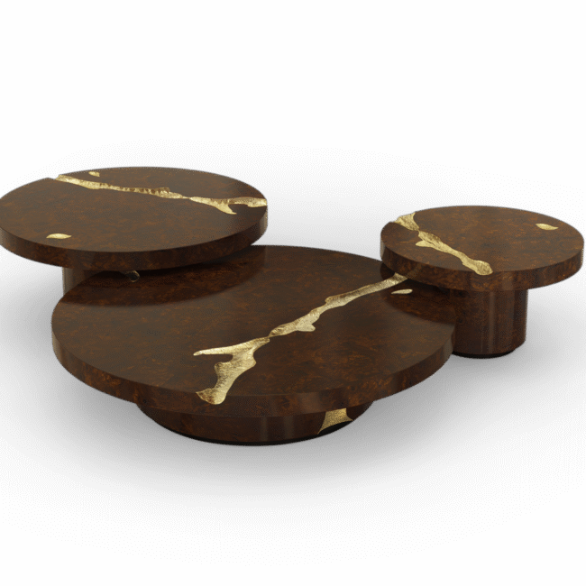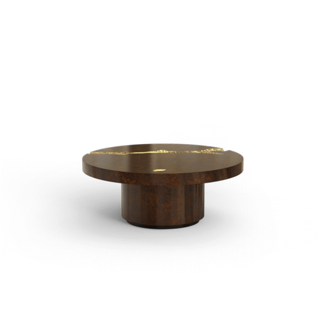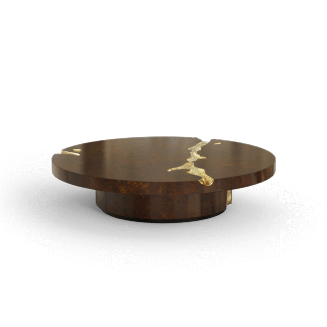 The elegant round center table is built from mahogany wood and features an exquisite polished brass surface detail. Its cracks are hand carved and inserted through polished brass sheets, which are hand hammered for a unique and organic finish. Its finest gold detail crack reflects a gold interior in a manifesto towards power. Flawless and bright, the remaining poplar root surface will raise the bar of the most sophisticated living rooms. Designed and built to make an impression and deliver an unmatched experience, Empire contemporary coffee table is ready to make a statement any occasion.