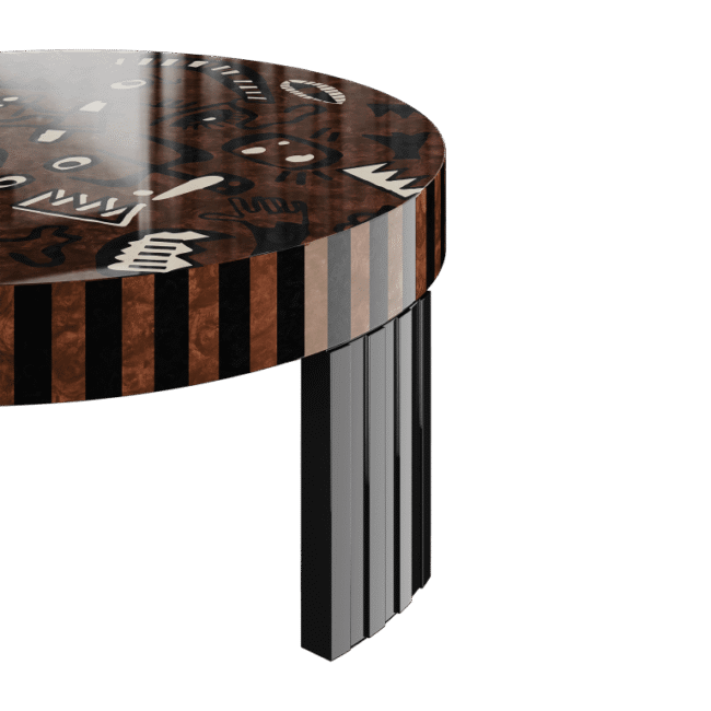 Folk Center Table brings an unmistakable design style. This refined and modern center table will add a vibrant accent to a contemporary living room. The three-legged table features an eye-catching top with marquetry details, a collecter furniture piece that enlivens any interior design project. This center table reflects enigmatic symbols and compositions influenced by 20th-century multicultural heritage and pop-culture icons, the expressiveness of our times. Folk Center Table