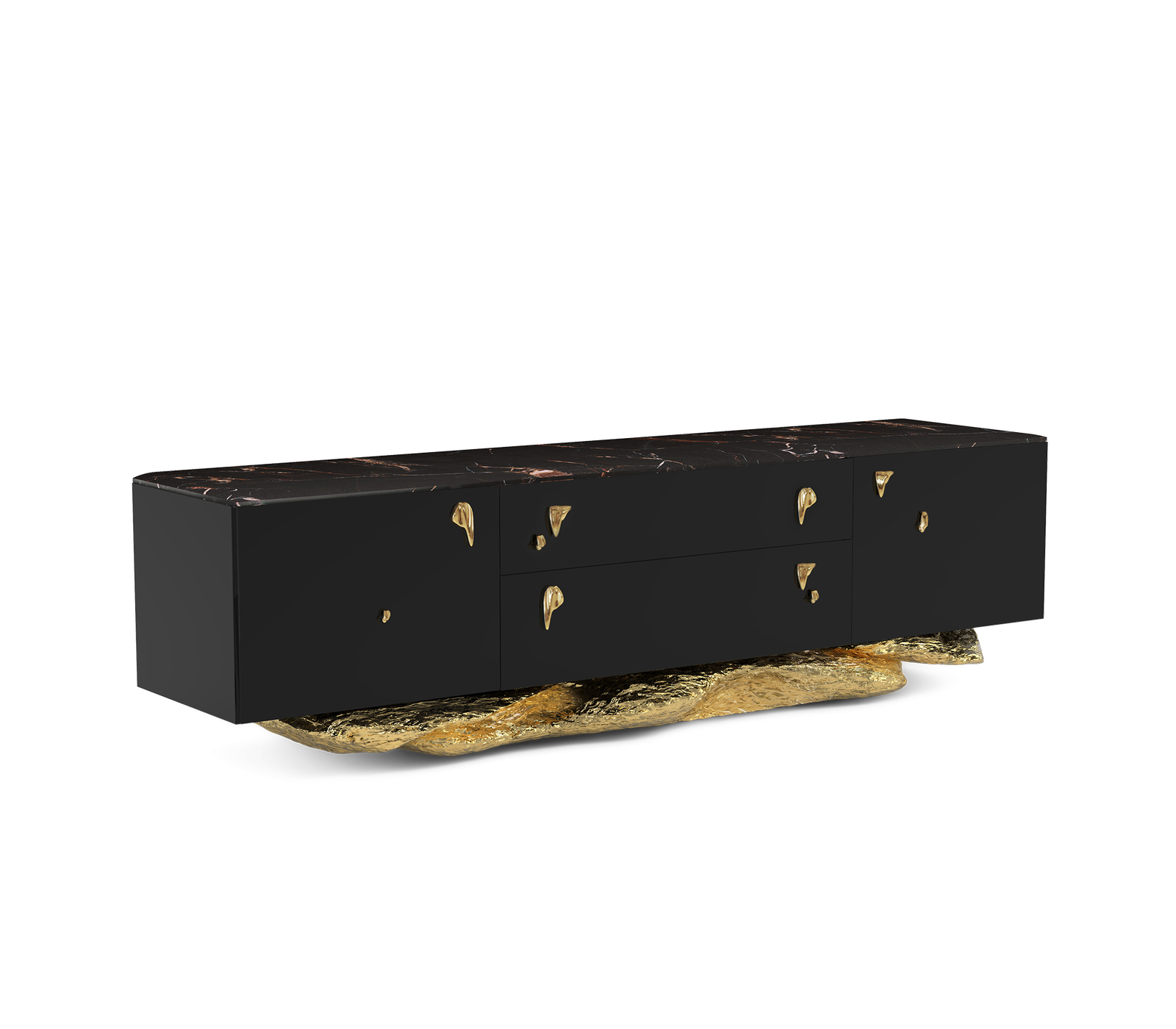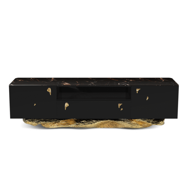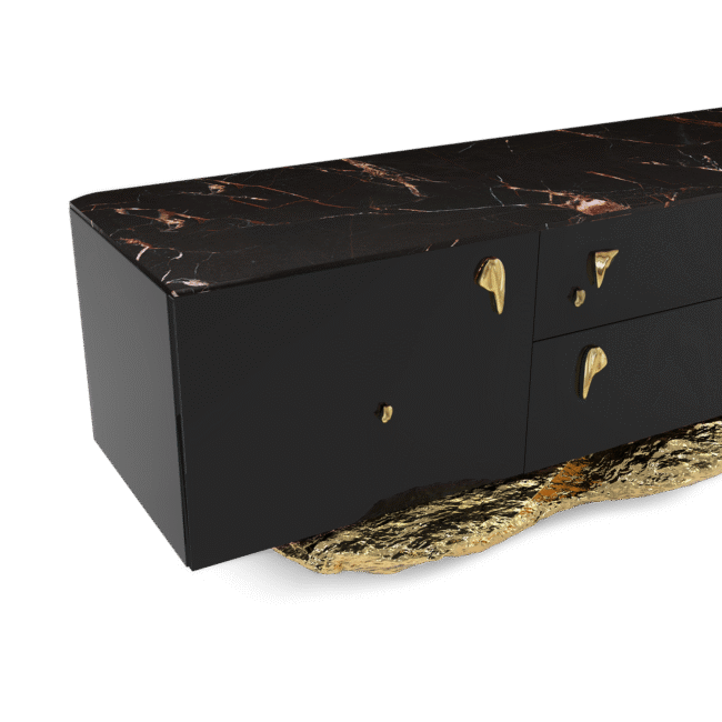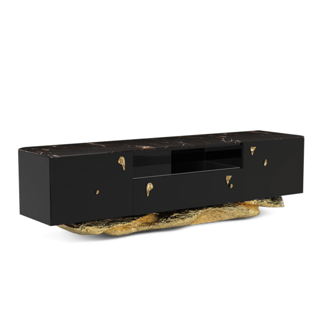 The wood structure is black lacquered, base in polished hammered brass and a top in Sahara Noir Marble. 2 doors, 1 drawer and 1 shelf in smoked glass inside each door. One space for electrical equipment in the middle with smoked glass. Base: Polished Hammered Brass.