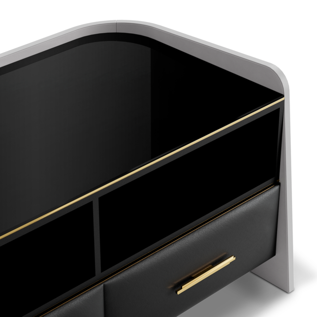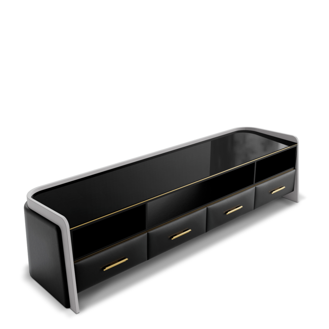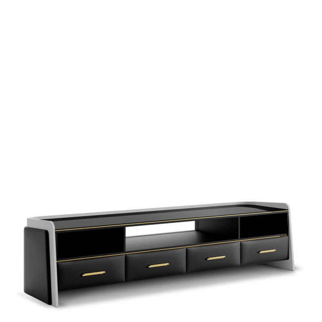 The Charla TV cabinet becomes the new essential classic for your living room. Functional and sophisticated, this supportive piece offers plenty of storage room, with four drawers upholstered in beige Nata leather, and grey leather adds a lavish touch to its back and lateral surfaces. Charla is a tasteful and daring piece with a modern identity!