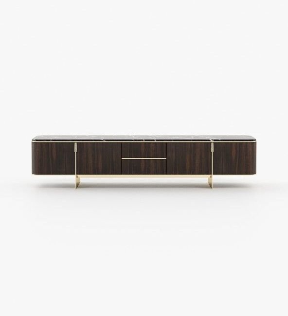 The Dean TV cabinet is a mid-century piece with charm, featuring a stunning marble top supported by a wooden structure and metallic details for a luxury touch.