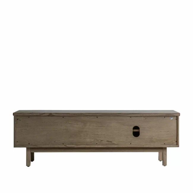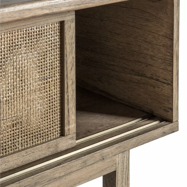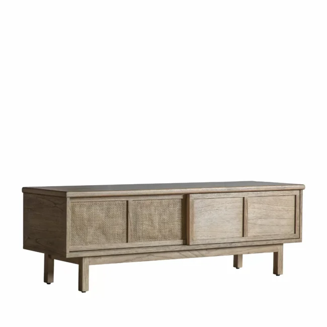 Developed with Japandi influences to give the ideal fusion of Japanese and Scandinavian design. This stylish media unit, which is crafted from Mindy ash solids and veneers, combined with hand-woven cane inserts, features sliding doors. This is the perfect range to add a touch of unique style to any interior, featuring a traditional lightly weathered finish with modern slatted detailing, hand-woven cane and brushed bronze handles. Also including a sideboard, cupboard, coffee and console table, plus a practical supper table and unique slatted side table, this collection adds a touch of simplistic minimalisation to any interior space.
