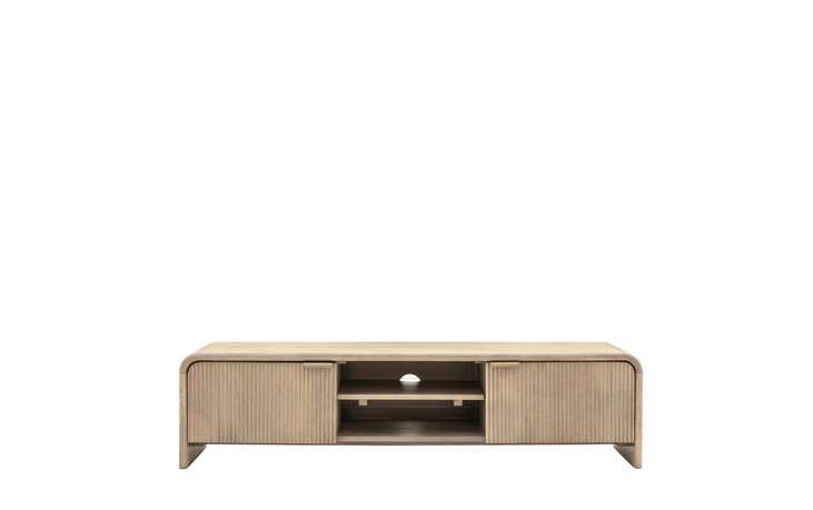 Lonna Media Unit: This media unit is a functional and stylish solution for media storage. With a curved top and fluted door detailing, it provides ample space for entertainment essentials. The sleek design fits effortlessly into modern living spaces, offering both organization and aesthetic appeal.