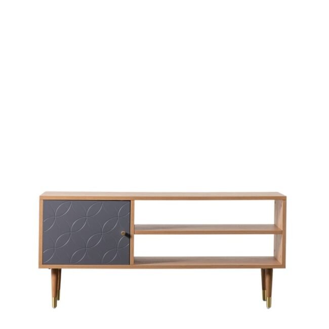 This lovely Media Unit makes an unusual eye-catching feature piece, with a combination of a painted grey finish and natural oak veneer. The unit combines colour and shape to great effect, with a routed geometric circular pattern, reminiscent of Bauhaus design, on the painted door. A brass handle on the cupboard door is complemented by brass ‘socks’ on the solid oak legs. The unit is also available in white, and the collection also includes other matching and coordinating pieces.