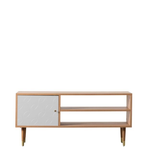This lovely Media Unit makes an unusual eye-catching feature piece, with a combination of a white painted finish and natural oak veneer. The unit combines colour and shape to great effect, with a routed geometric circular pattern, reminiscent of Bauhaus design, on the painted door. A brass handle on the cupboard door is complemented by brass ‘socks’ on the solid oak legs. The unit is also available in grey, and the collection also includes other matching and coordinating pieces.