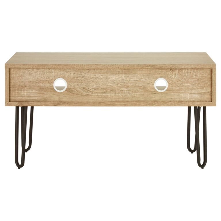 The veneer cabinet incorporates two compartments into its design, with round holes at the back that keep media cables neat and tidy. The veneer is smooth and sports a rich grain pattern. The cabinet stands on black metal legs with a hairpin design that softens the look.