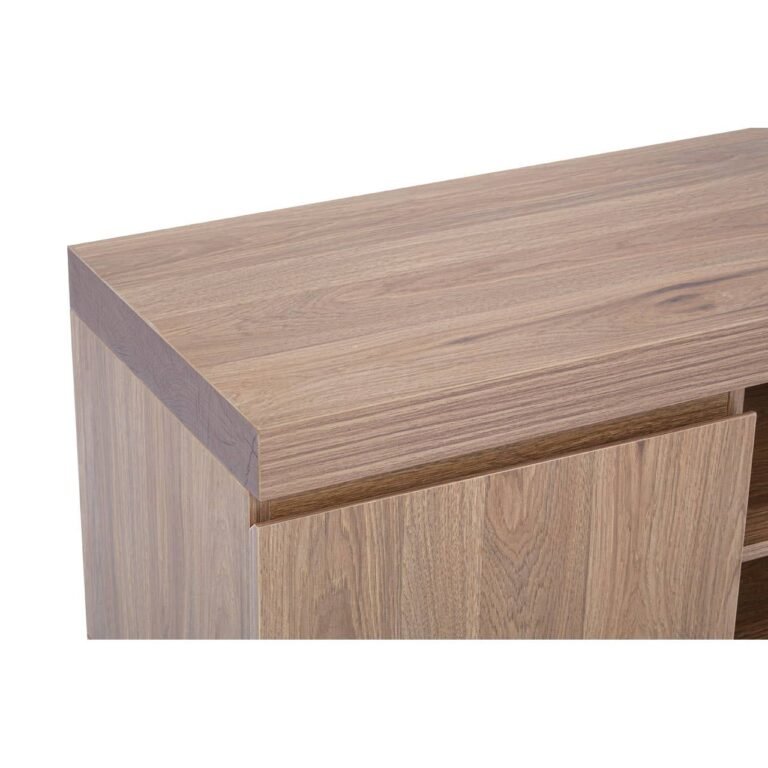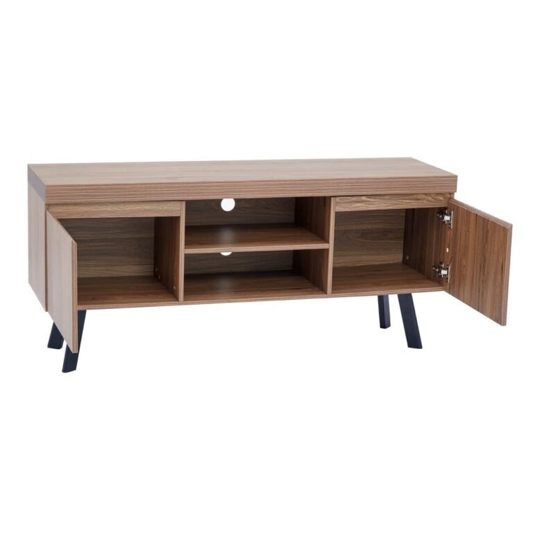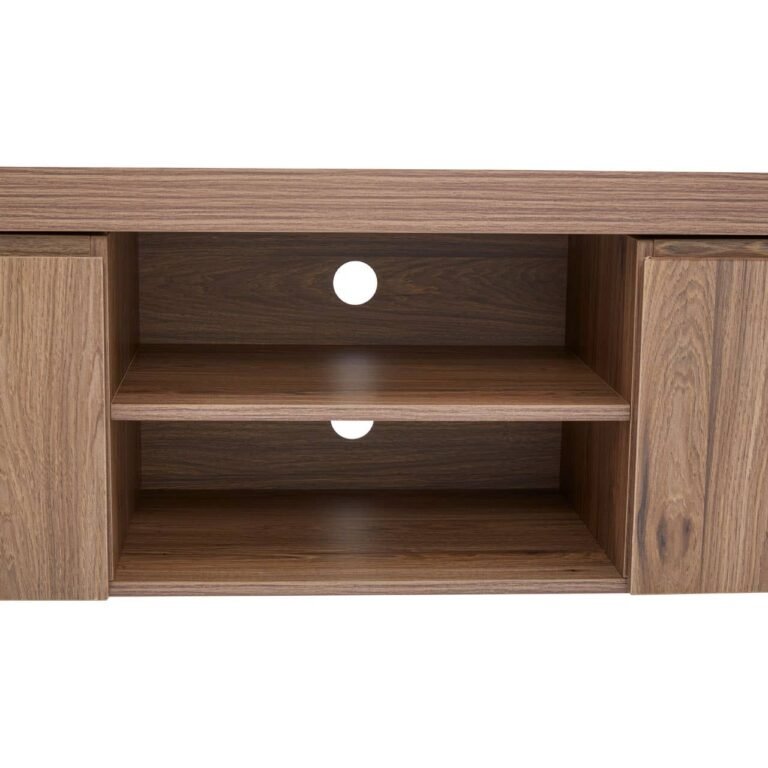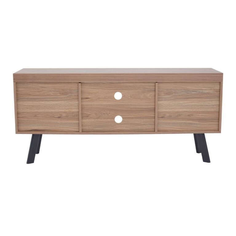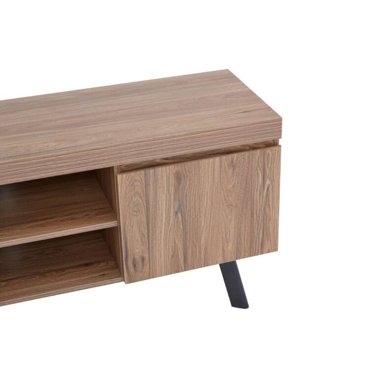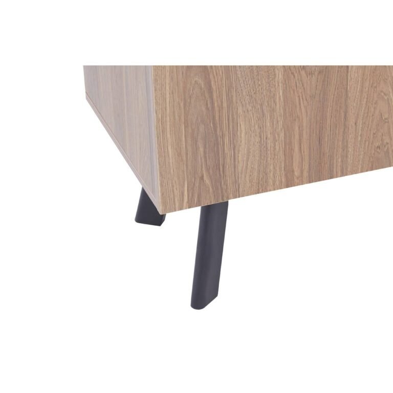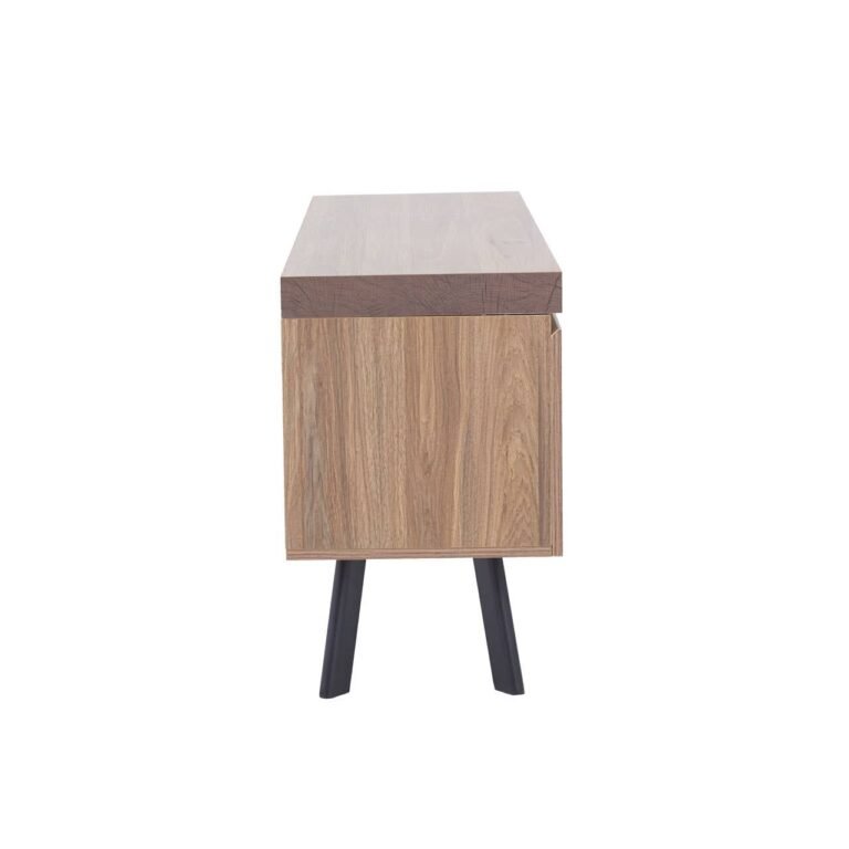 This Ulri Media Unit features two streamlined, handle-less cupboards and open shelving, complete with space to keep cables tidy and organised. The media cabinet has natural warmth from the wooden body and is contrasted with chic black metal, splayed, geometric legs.