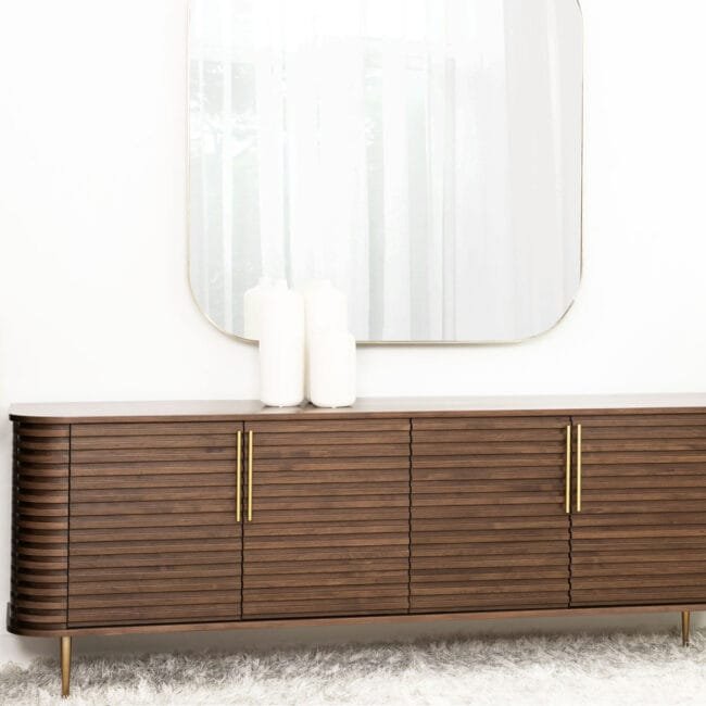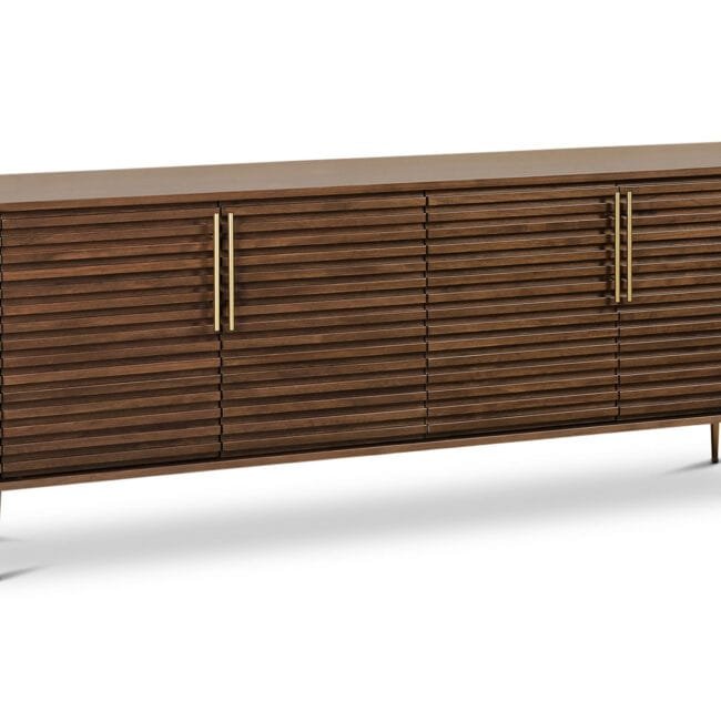 Inspired by the days of high glamour, the Paris Sideboard is a modern twist on mid 19th century Art Deco. Beautifully finished in natural walnut veneer, the Paris Sideboard has 4-doors with brass handles and legs. The Paris range can help achieve the perfect finish in a any home or interior design project and coordinates perfectly with the Paris Media Unit.