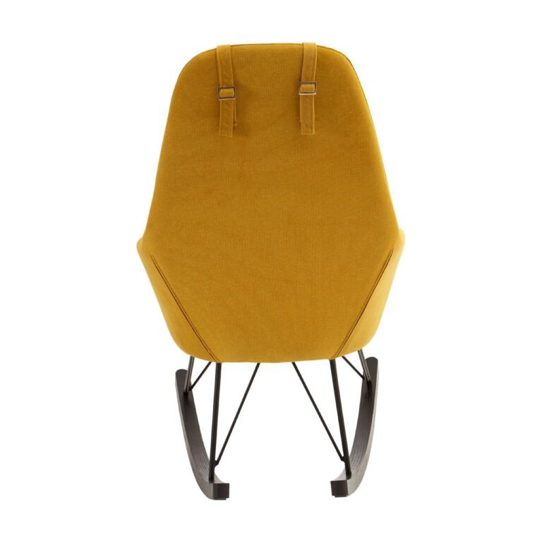 The Alnwick Yellow Fabric Chair rocks back and forth on a pair of oak veneer runners. In between seat and runners, black metal girders produce a simple lattice that provides added support while enhancing the aesthetic. From its round seating area, the chair spreads outwards to the armrests, before narrowing into the backrest. A plump headrest provides added comfort.