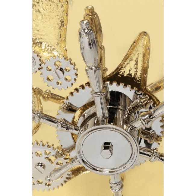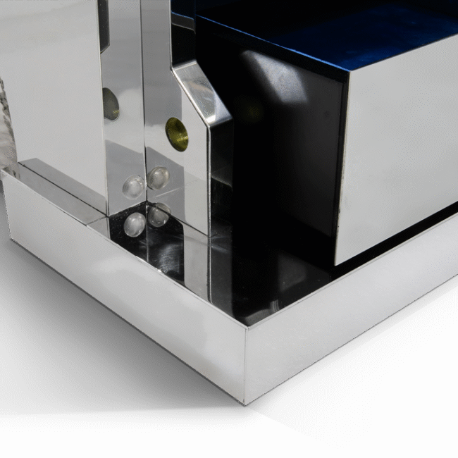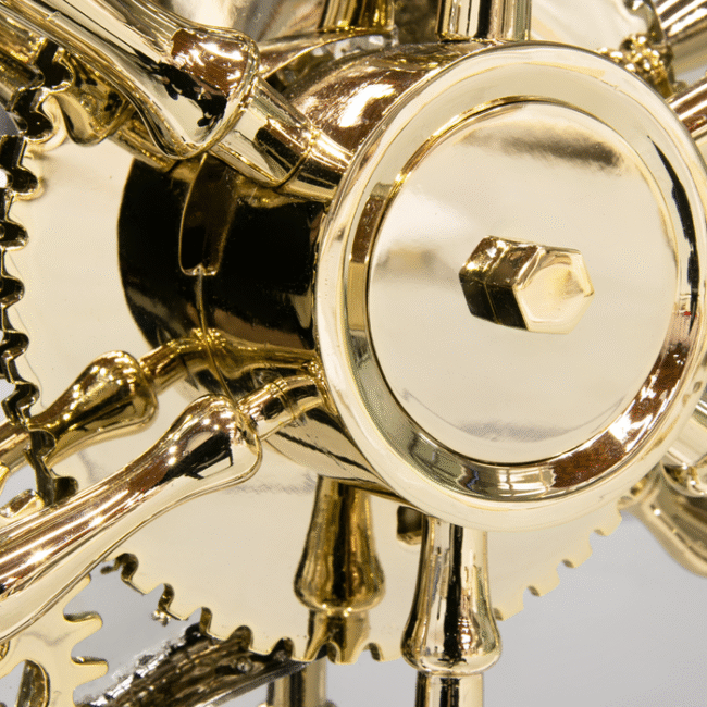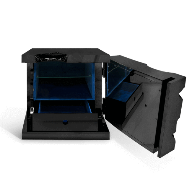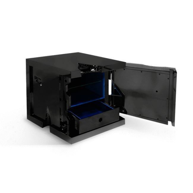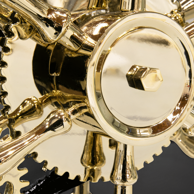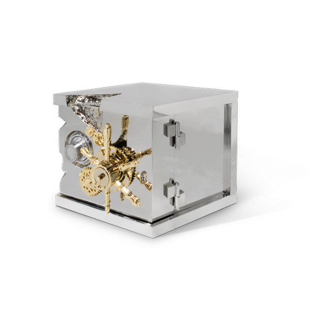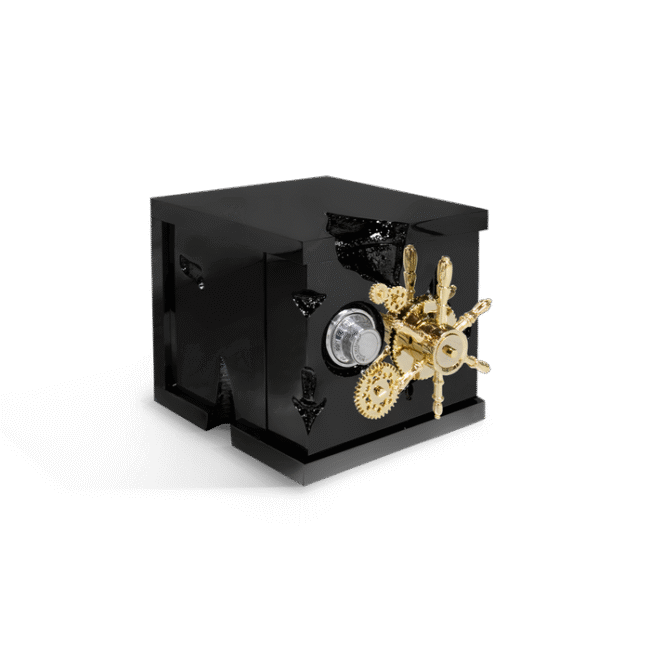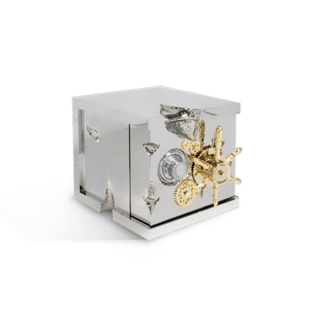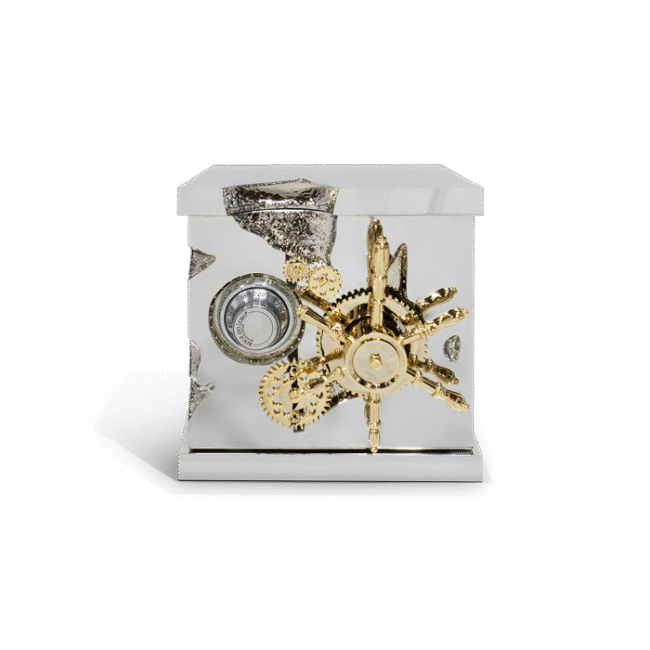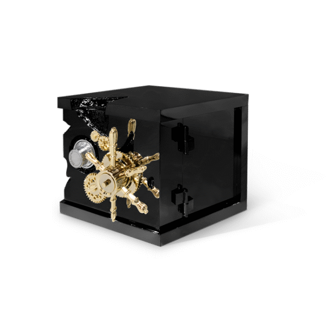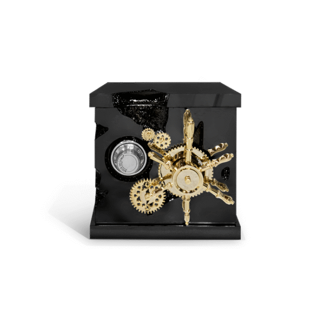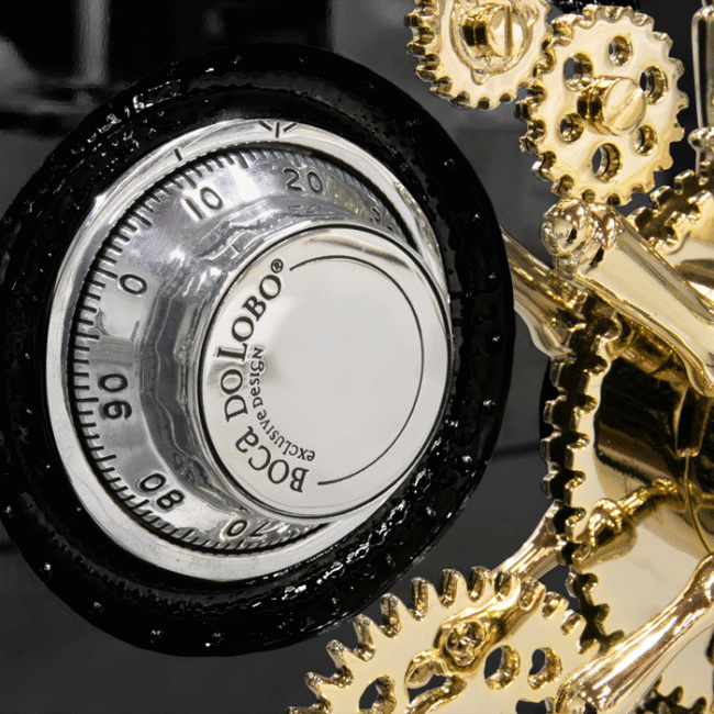 The Millionaire Jewelry Safe is produced in wood and plated in stainless steel. The Jewelry Safe is then lacquered in black and features a set of cast brass gears.